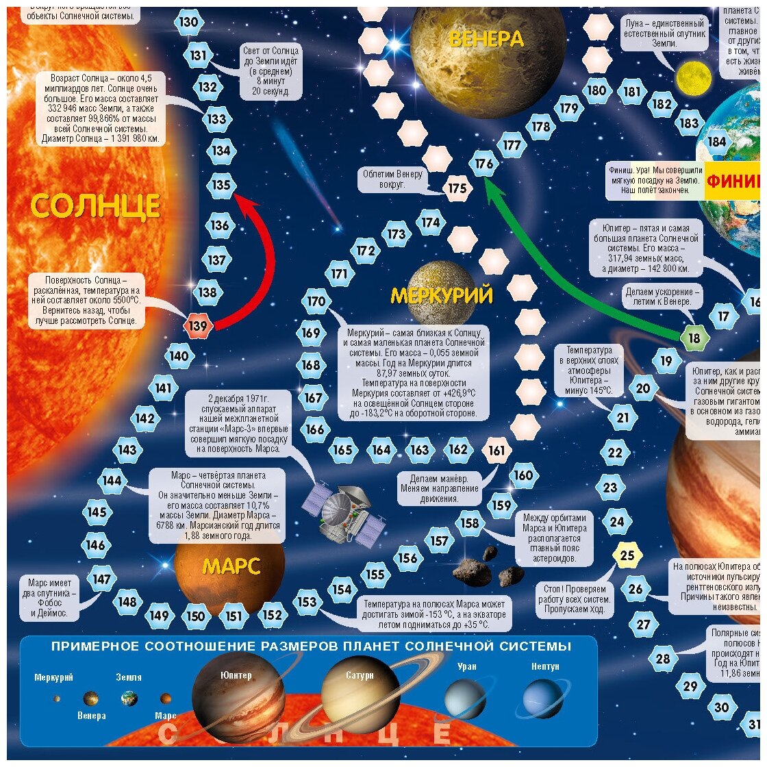 Покупала игру в полном неведении, что она собой представляет, так как в интернете именно о ней отзывов не было. Все писали про какую-то аналогичную игру от другого издательства. К счастью, я не прогадала. Очень интересная игра-ходилка для младшего и, я думаю, среднего школьного возраста. В комплект, помимо игрового поля, входит 4 фишки и кубик с точками. На игровом поле изображена Солнечная система, причем планеты нарисованы со спутниками и дано краткое описание. Каждое действие, например, отход на два кружка назад объясняется с космической точки зрения, например, сильной гравитацией. Очень познавательно! Само игровое поле из плотной бумаги, поэтому, надеюсь, послужит нам долго. Приходит в целлофановом пакете. Размер, по моим измерениям, 58х42 см.