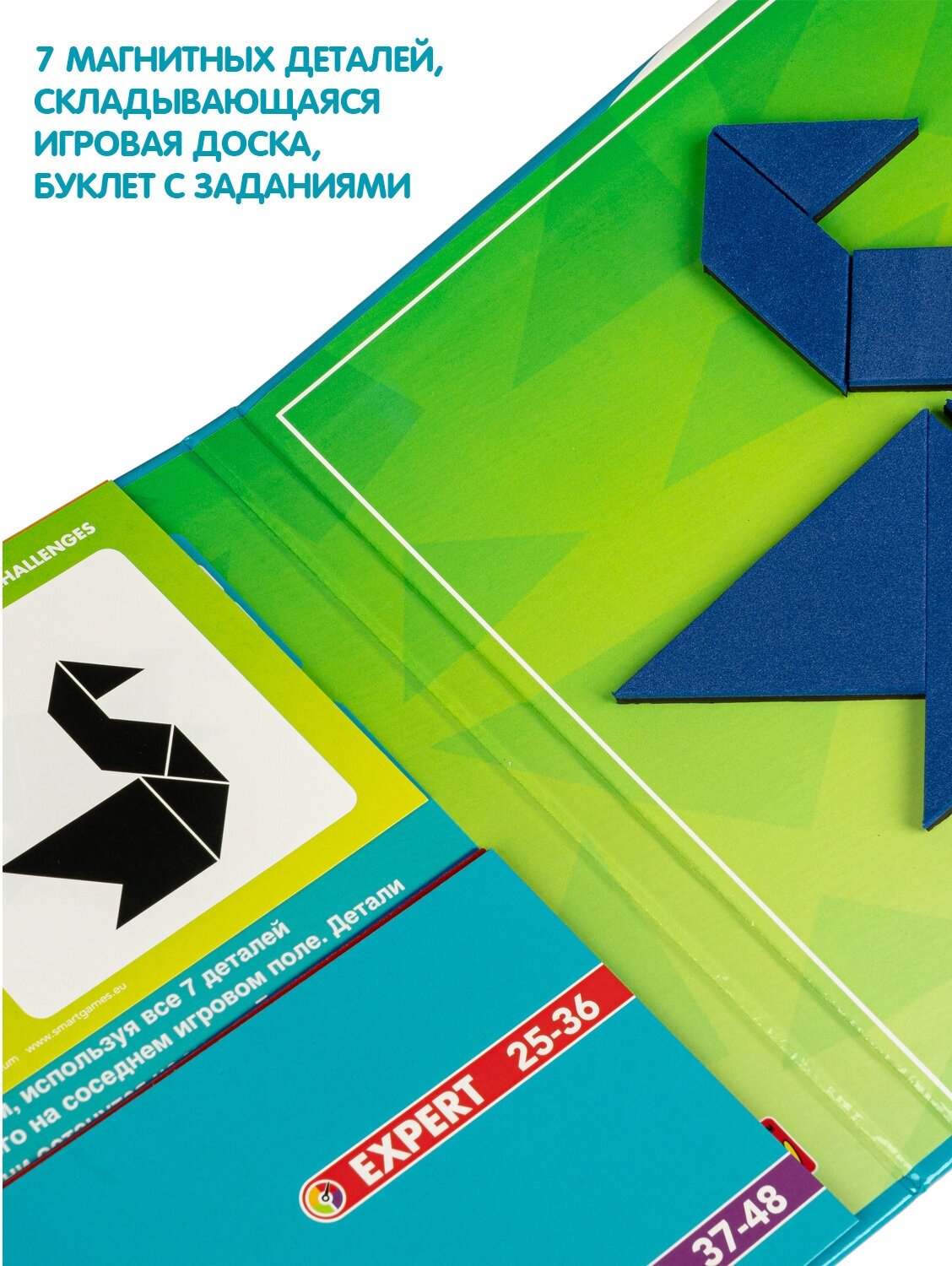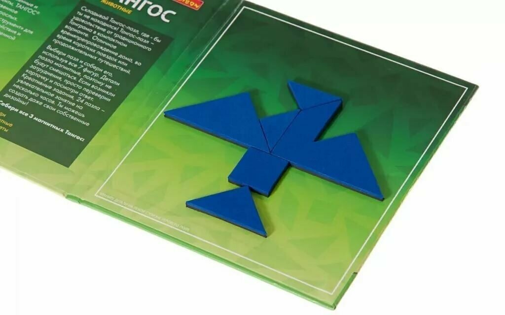 Удивительная старинная игра, несмотря на кажущуюся простоту, одинаково увлекает и детей, и взрослых. Столетия назад в Китае была придумана удивительная игра, состоящая из семи плоских геометрических фигурок для игры, которые называются танграммы: пять треугольников, один квадрат и параллелограмм, из которых выкладывали множество фигур-силуэтов. Это идеальная игра для длительных путешествий, но как скоротать время в дороге, не растеряв все танграммы? Игра "Тангос" изготовлена в виде маленькой плотной книжечки, которая содержит множество заданий с изображениями различных животных. Фигуры можно складывать из магнитных деталей, которые крепко держатся внутри книжечки-футляра.