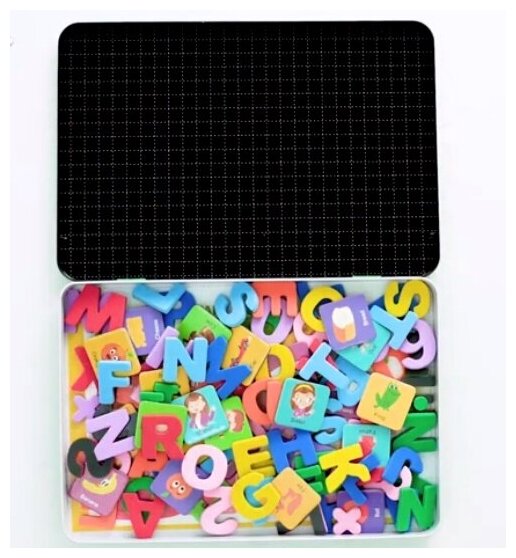 Магнитные цифры и буквы можно прикреплять не только к металлической коробке, но и к любым другим металлическим поверхностям. Когда ребенок освоит задания, входящие в комплект, можно придумывать новые задания и составлять из алфавита другие слова, пополняя словарный запас.