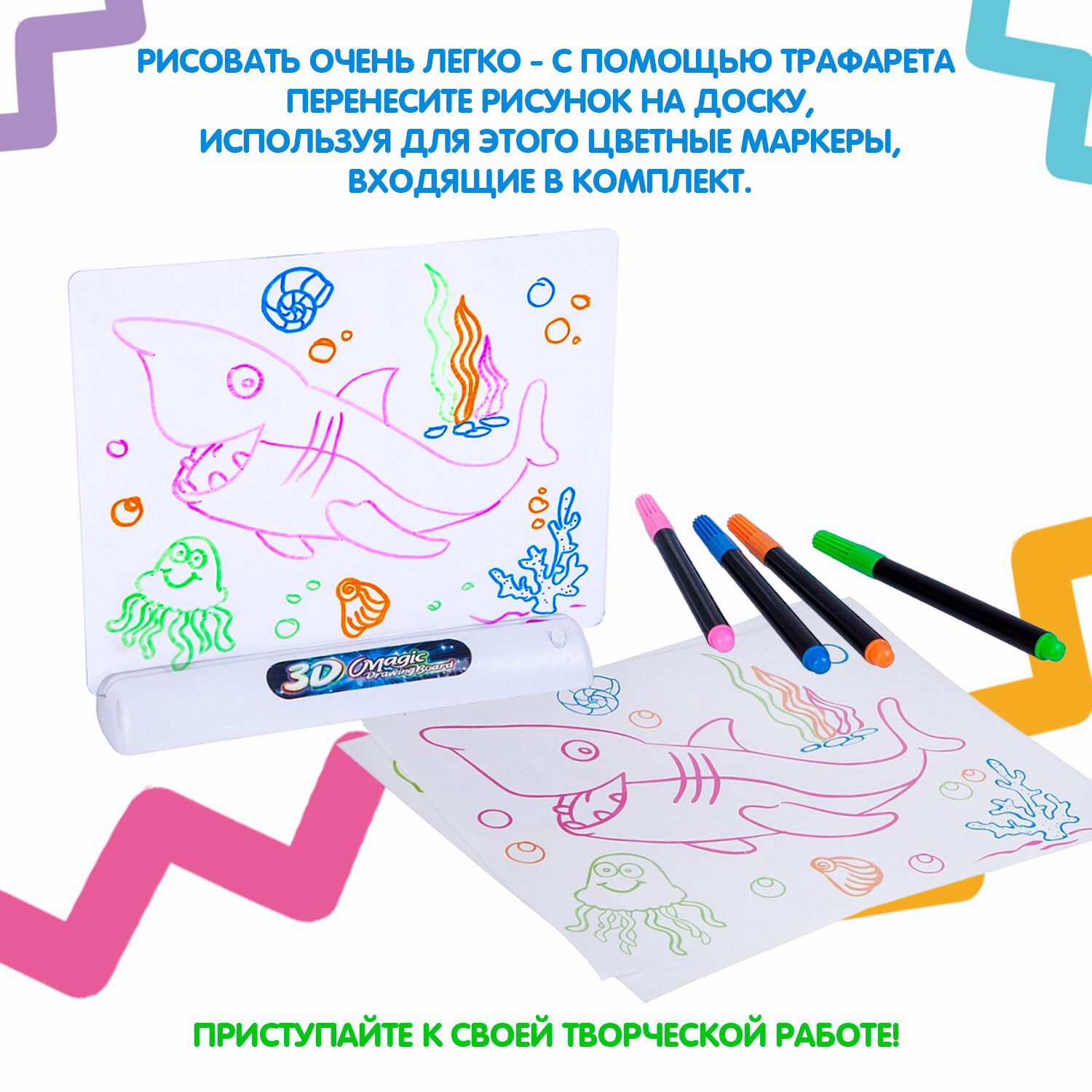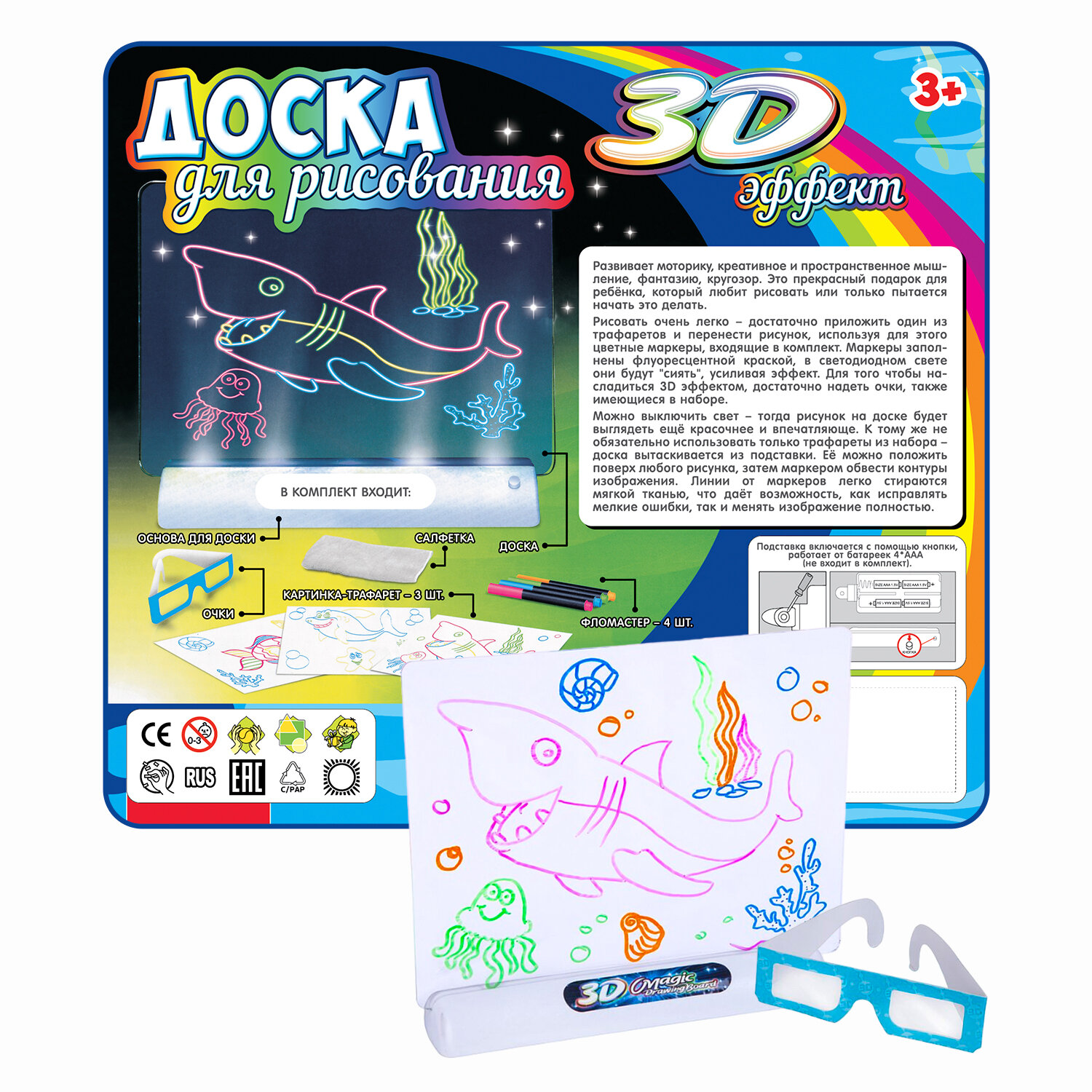 Рисовать очень легко - достаточно приложить один из трафаретов и перенести рисунок, используя для этого цветные маркеры, входящие в комплект. Маркеры заполнены флуоресцентной краской, в светодиодном свете они будут "сиять", усиливая эффект. Для того чтобы насладиться 3D эффектом, достаточно надеть очки, также имеющиеся в наборе. Можно выключить свет - тогда рисунок на доске будет выглядеть еще красочнее и впечатляюще.