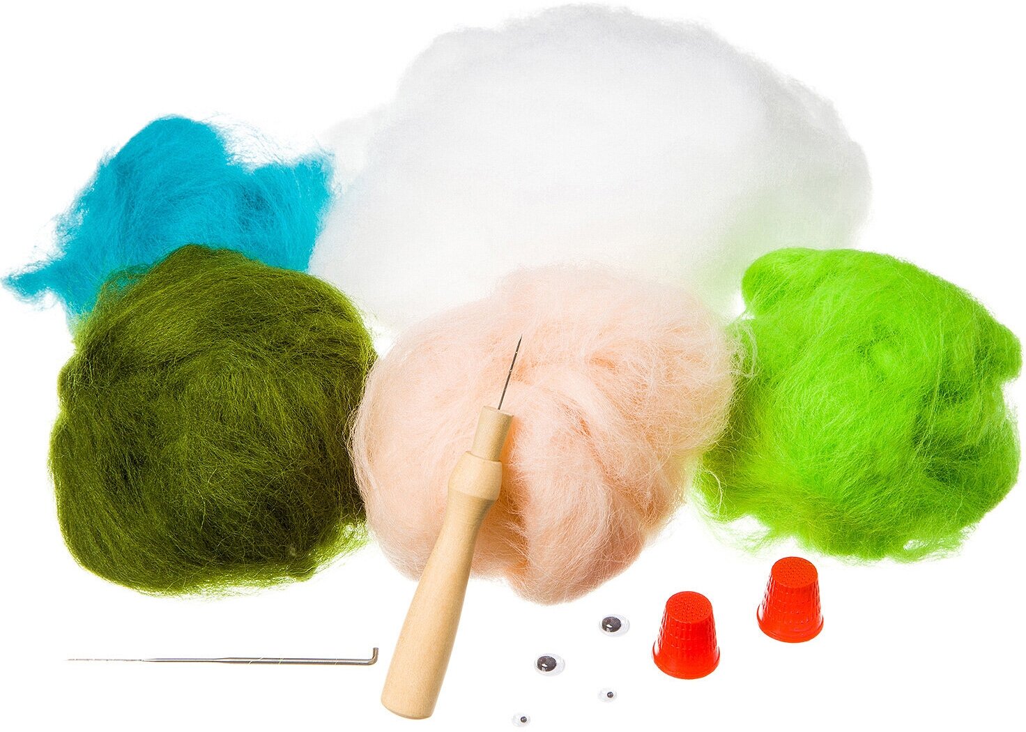 | Комплектация | набор шерсти различных цветов, набивной материал, инструменты для валяния (иглы, наперстки), элементы украшения, подробная инструкция. |