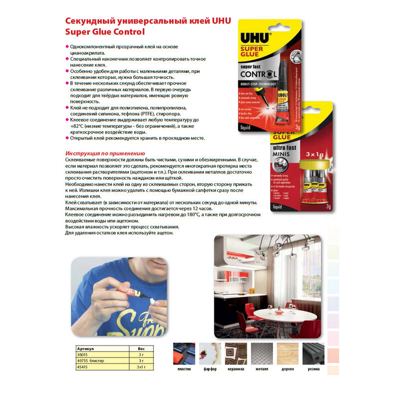 Так как секундный UHU Super Glue схватывает в течение нескольких секунд, его предпочтительно использовать для склеивания небольших поверхностей.