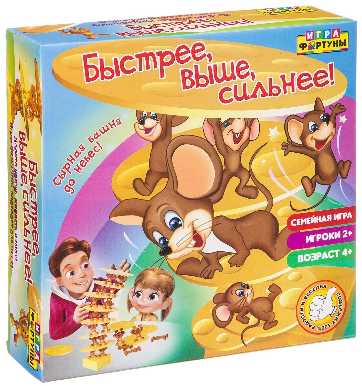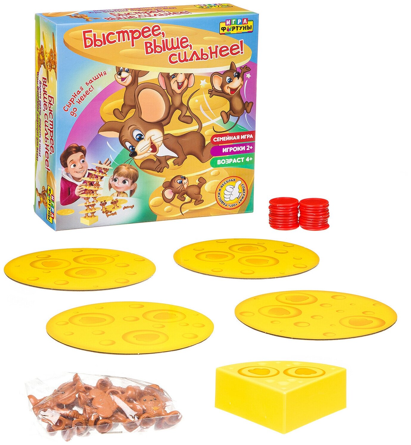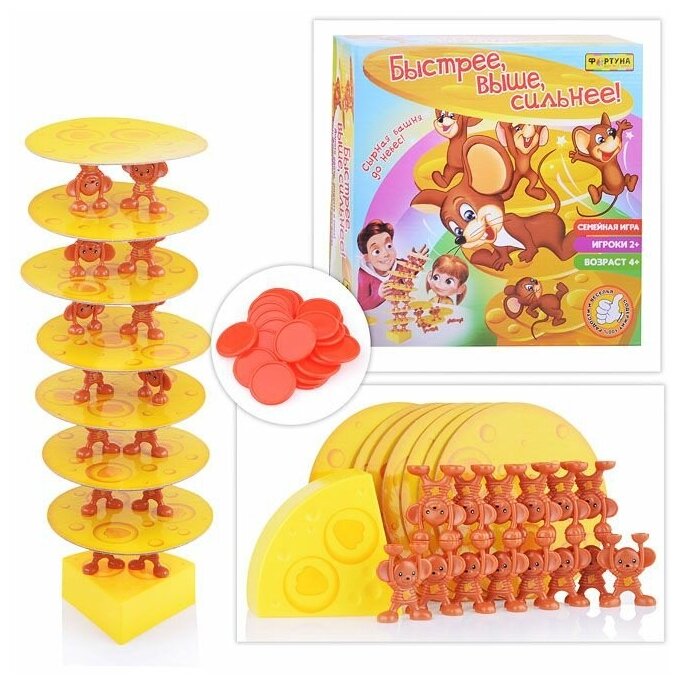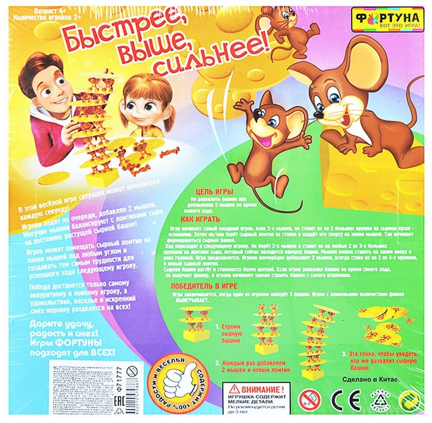 | Комплектация | Кусочек сыра - 1 шт; Сырные пластины - 7 шт; Фигурки мышат - 14 шт; Жетоны |