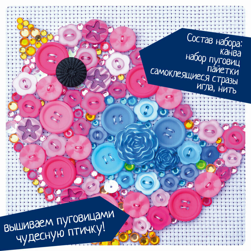 Состав набора: канва, набор пуговиц, пайетки, самоклеящиеся стразы, игра, нить.