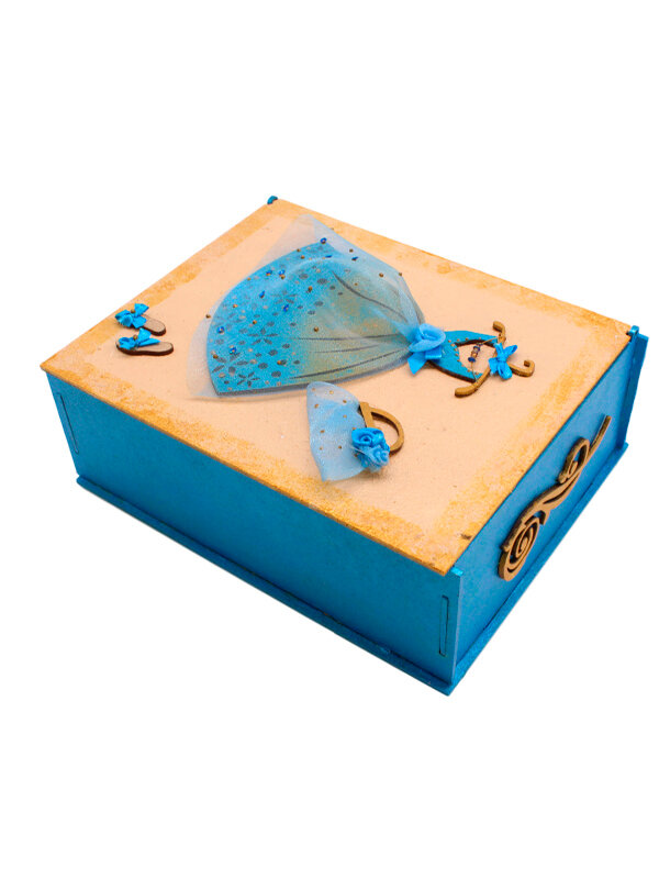 | Состав набора | заготовка шкатулки МДФ; краска; губка; органза; лента атласная; бисер; пайетки; проволока; инструкция |