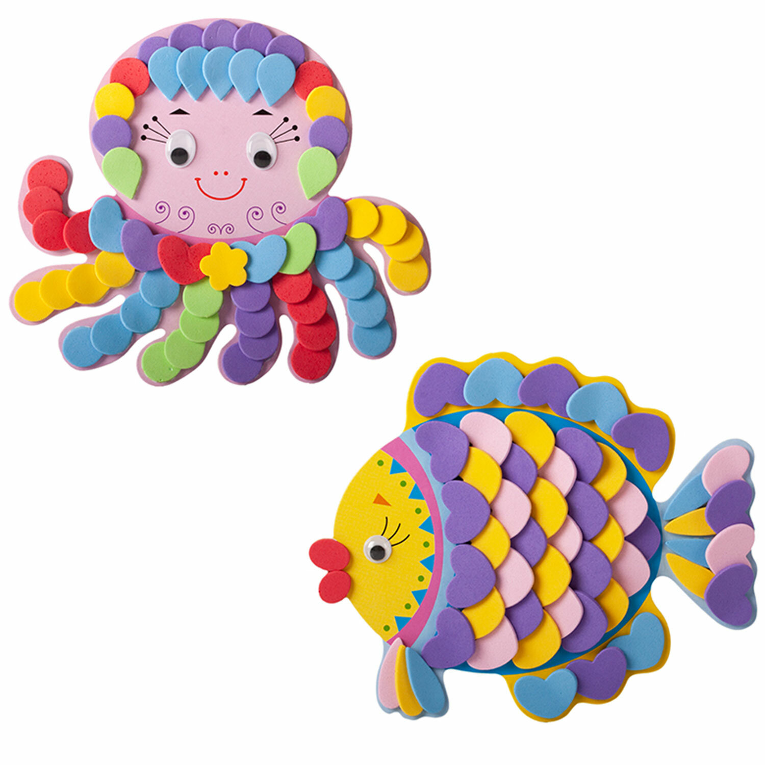 Можно ли плоскую картинку сделать объёмной? С помощью наборов для творчества из серии "Аппликация. Игрушки на магнитах" это возможно! Если внимательно следовать инструкции, то рыбка и осьминог обретут интересный и необычный рельеф. Подобный эффект достигается благодаря оригинальной технике наклеивания деталей: если при наклеивании одна деталь будет немного находить на другую, то получится эффект "чешуек".