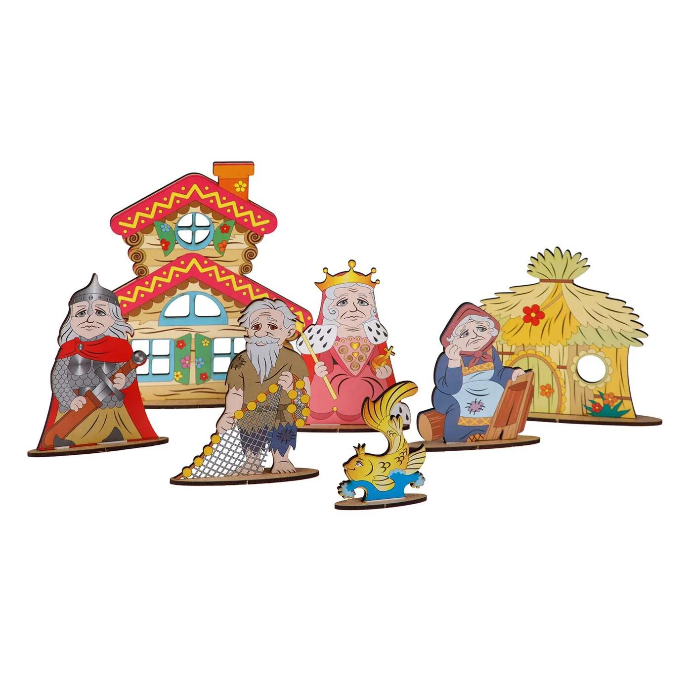 Хорошие фигурки, но мало. По сюжету прям не хватает слуг. Для устойчивости фигурки лучше проклеить. Такой вариации сказки никогда не слышала) старик зовет рыбку "-Золотая рыбка, приплыви к берегу, встань ко мне передом, а к морю хвостом". Все же Пушкин привычнее "Стал он кликать золотую рыбку. Приплыла к нему рыбка и спросила: "Чего тебе надобно, старче?".