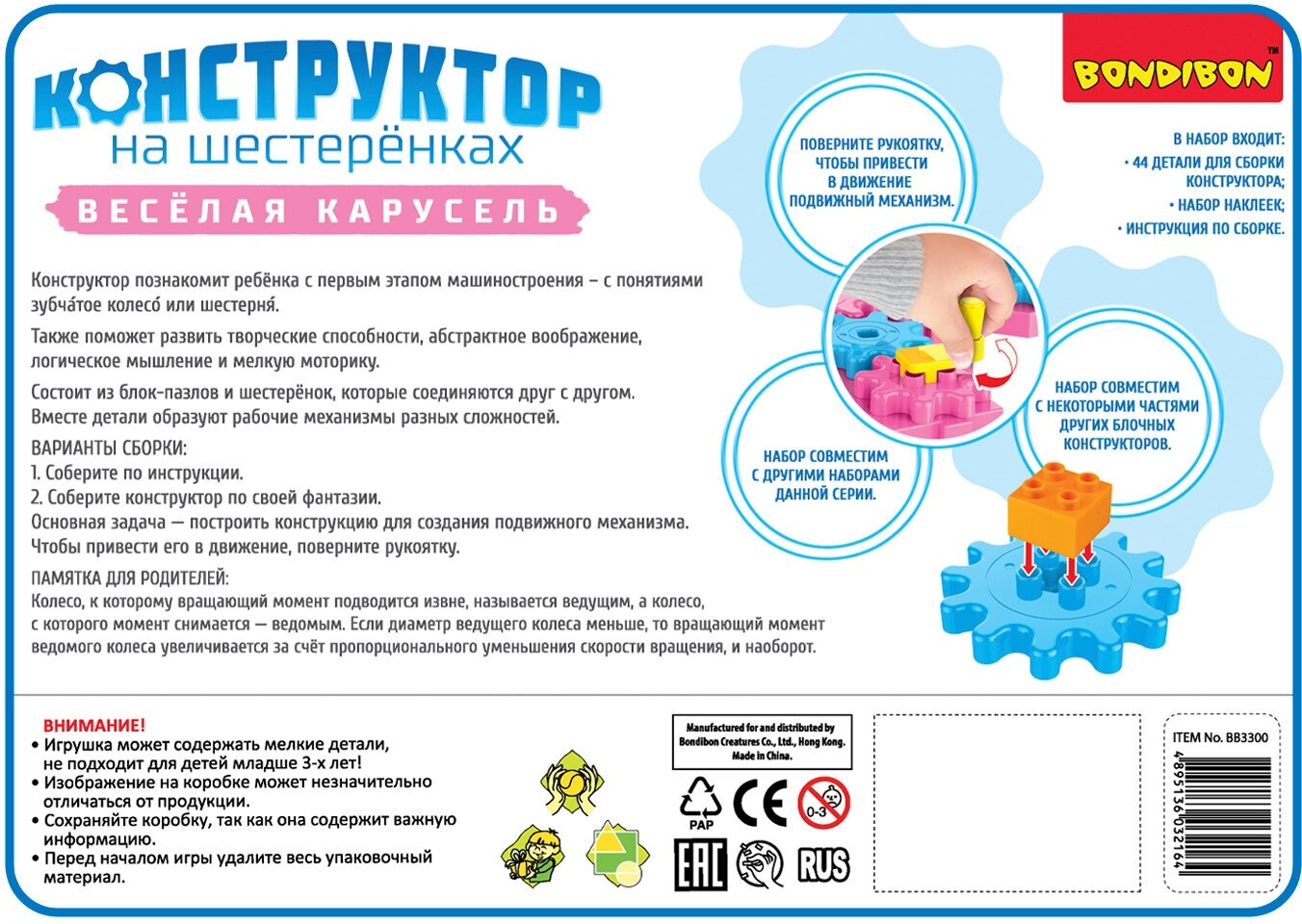 Конструктор на шестеренках "ВЕСЕЛАЯ КАРУСЕЛЬ" 44 деталей (ВВ3300); BONDIBON, 2018