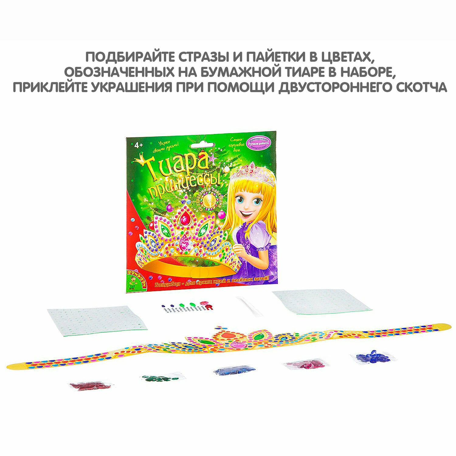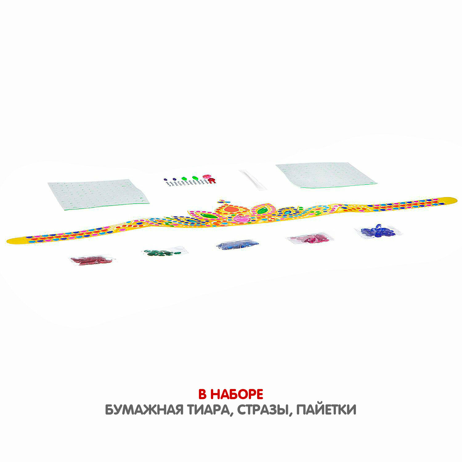 Аппликация стразами и пайетками тиары из бумаги -увлекательное занятие для ребёнка. Подбирайте стразы и пайетки в цветах, обозначенных на бумажной тиаре в наборе. Приклейте украшения при помощи двустороннего скотча.