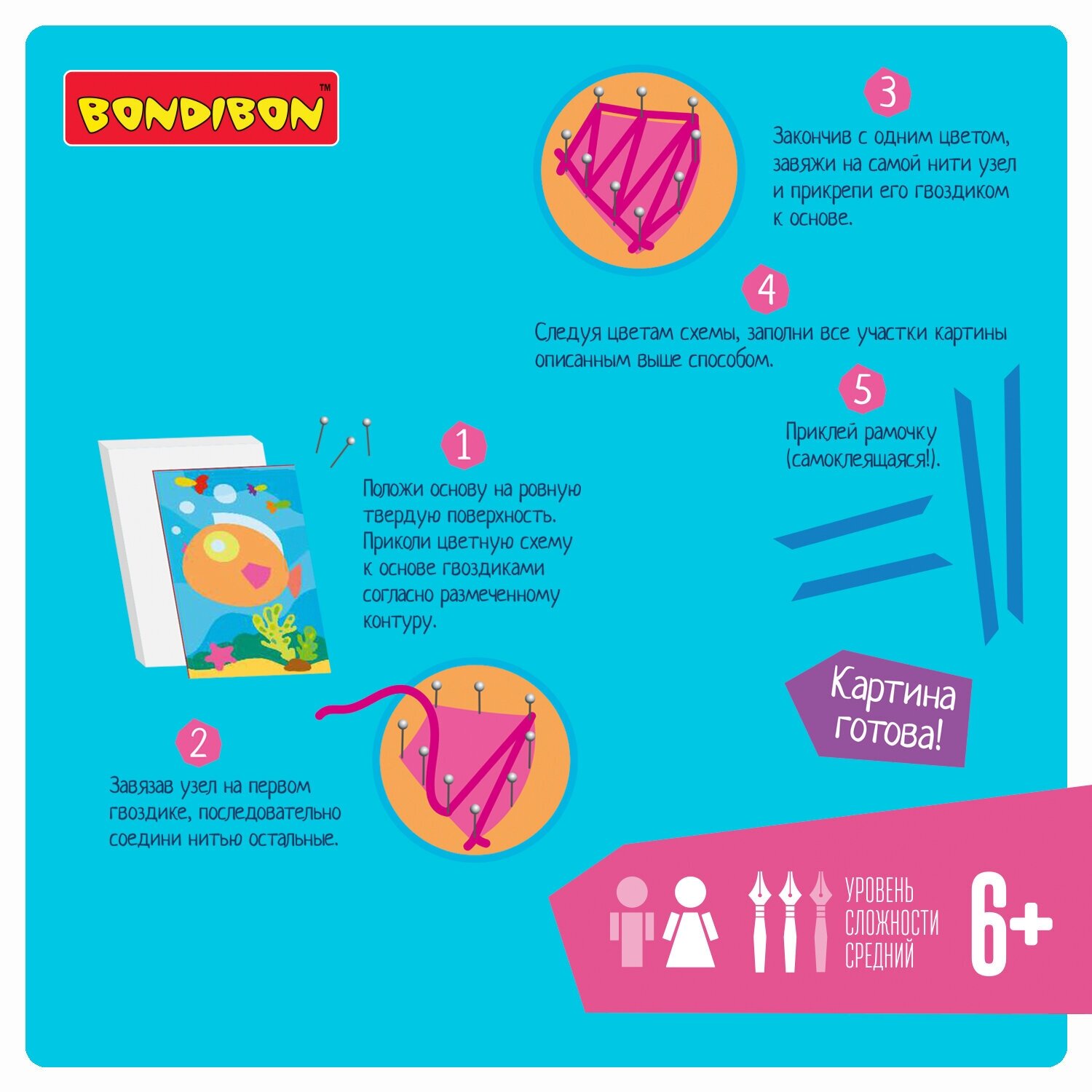 Покупала для сына 5 лет. Несмотря на то,что указано "для девочки" мне показалось, что картинка универсальная. Возраст 6+ явно занижен. Рала вторую дочери 7 лет, она умучилась. Я ей тоже помагала. Сын сам смог воткнуть лишь гвозди со шояпкой. Остальные сил не хватило, но я ему наделали дырок и дальше у него получилось втыкать гвозди без шляпки. Обматывать он не смог, по факту практически всю работу сделала я. Но ему очень понравилось и он просил ещё такие купить. Инструкция слабая. Завязывать узлы по ней не удобно. Мы завязывали по другому. Начало и конец должны быть в одном месте и тогда их связываешь. Рамка самоклеящаяся. Нитки мулине. Картинка висит на стене.