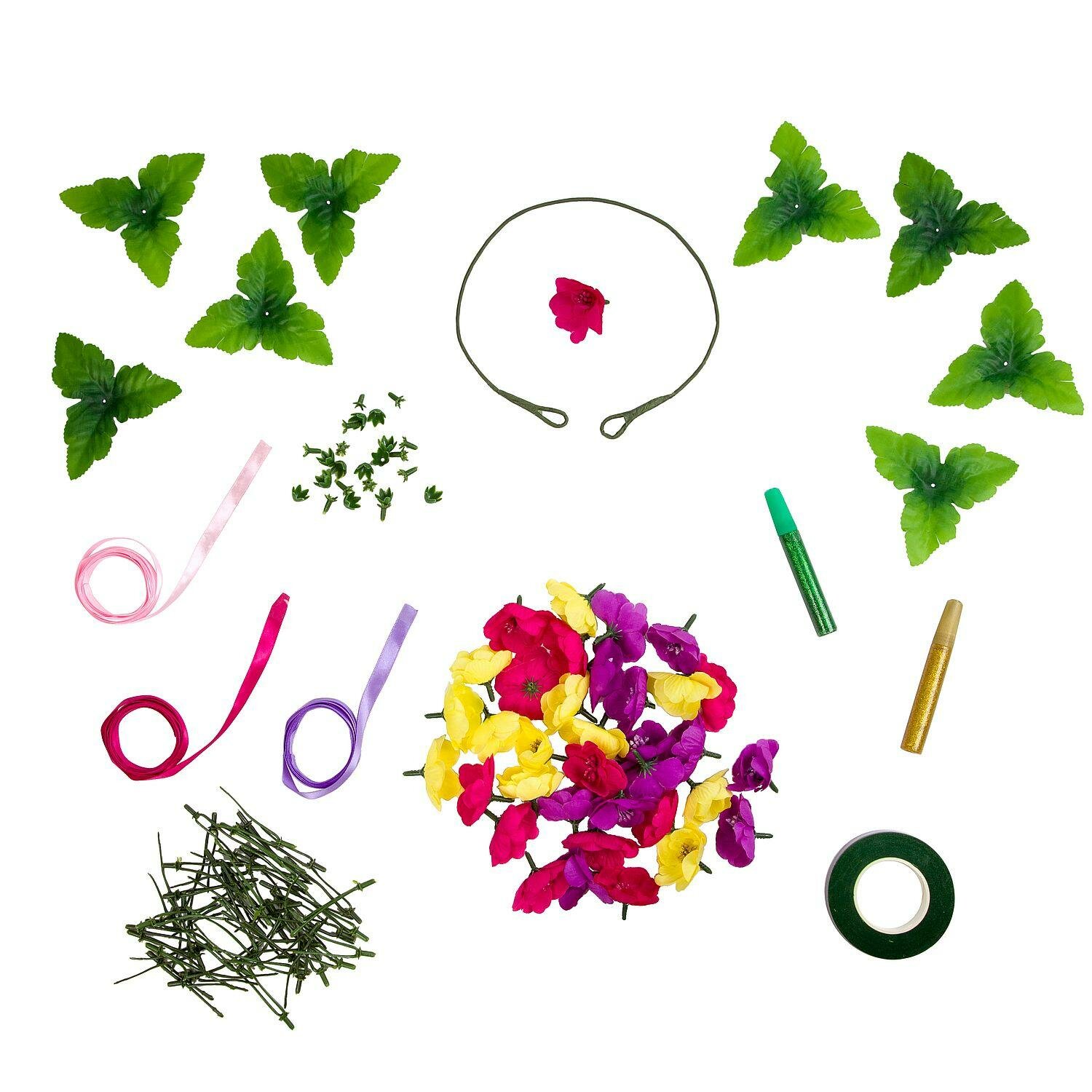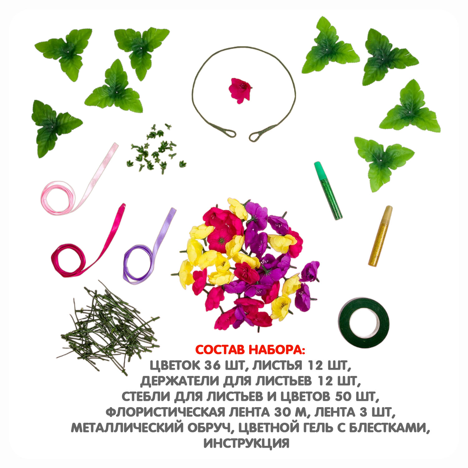 В наборе: цветок (4,5 см 36 штук), листья (10 см 12 штук), держатели для листьев (1,2х1,5 см 12 штук), стебли дл листьев и цветов (5,5 см. 50 штук), флористическая лента (30 м), металлический обруч, лента (3 штуки), цветной гель с блестками (2 штуки), инструкция.