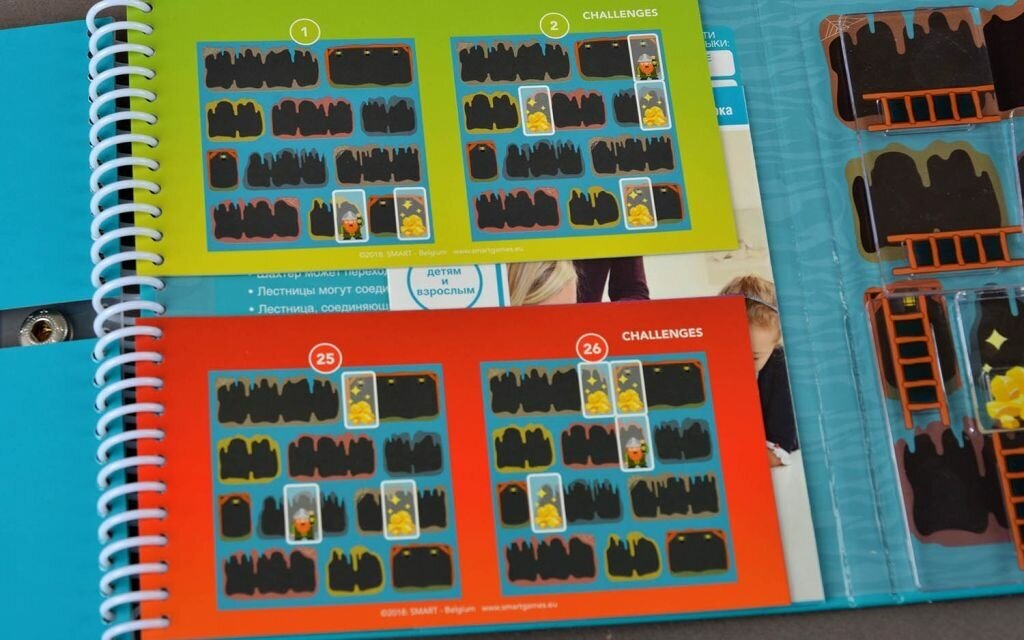 замечательная головоломка! идеальна для путешествий, надолго увлекает ребенка. смысл игры в том, что необходимо золото расставить по заданию, а затем разместить 3 детали с лестницами так чтобы гном-золотодобытчик смог добраться до своих сокровищ. В игре 48 заданий.к каждому заданию есть ответы.
