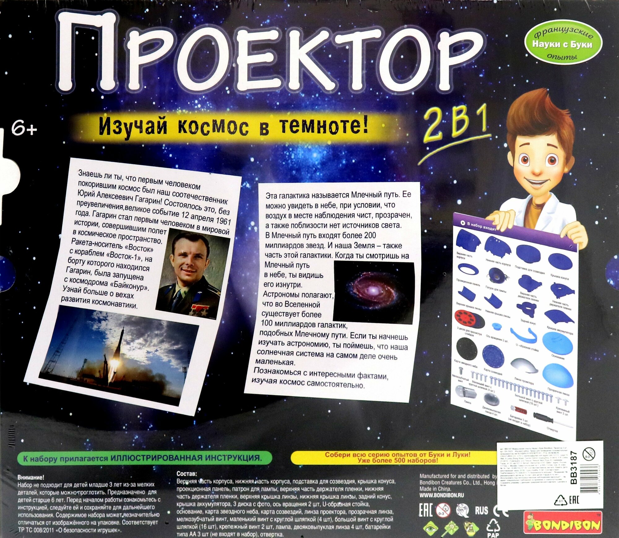Следуя подробной инструкции, ребёнок самостоятельно познакомится с принципами работы проектора и соберёт действующую модель. Кроме того, он узнает интересные факты из истории освоения космоса и изучит планеты, звёзды и галактики.
