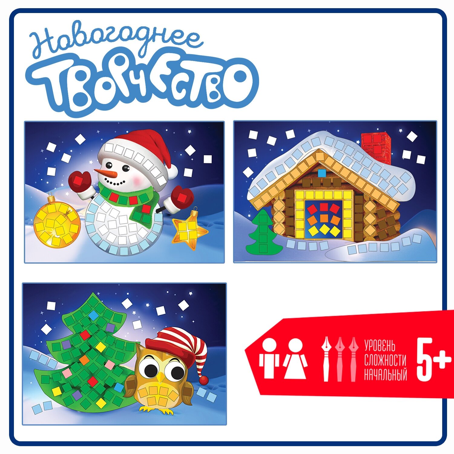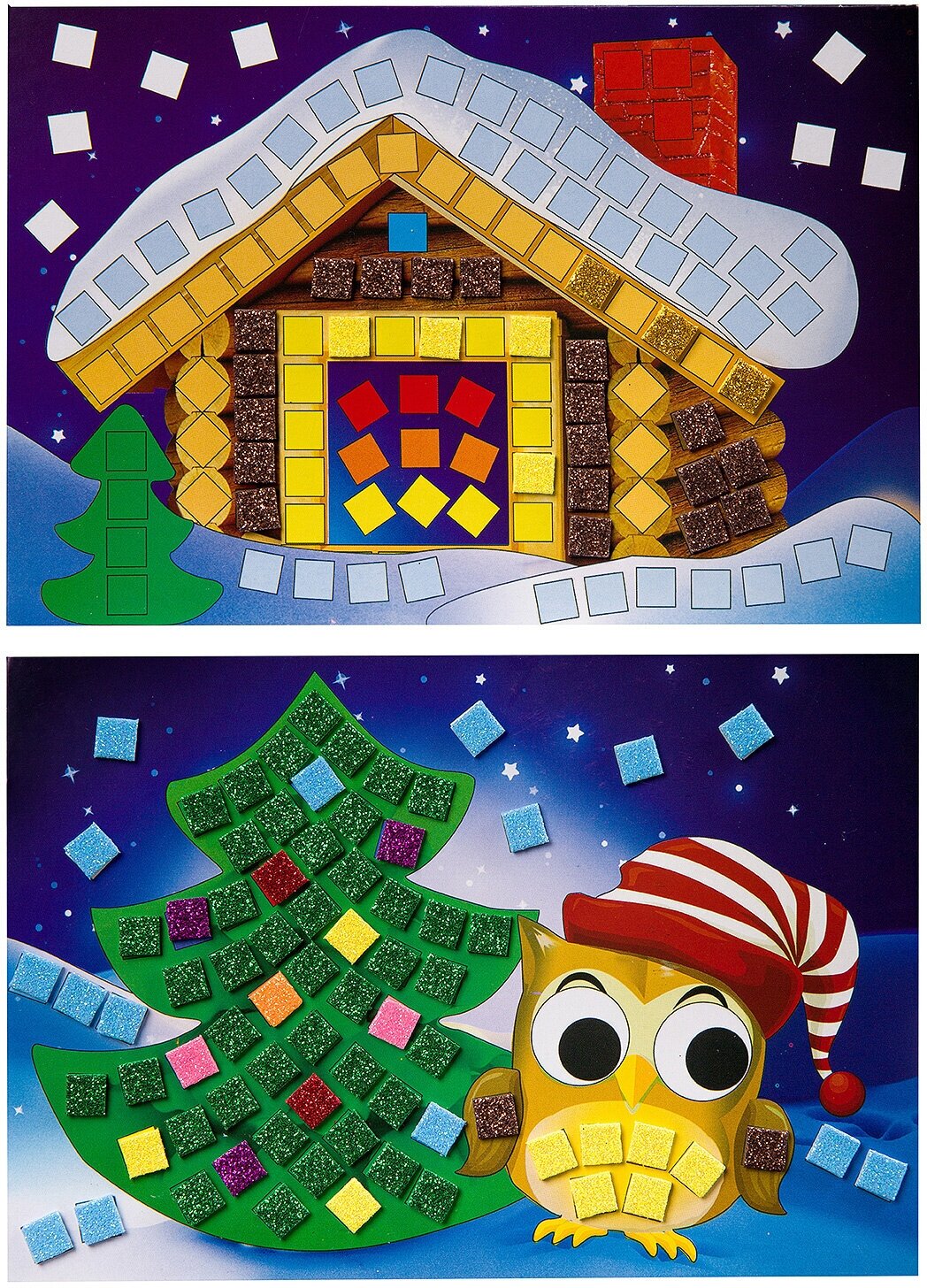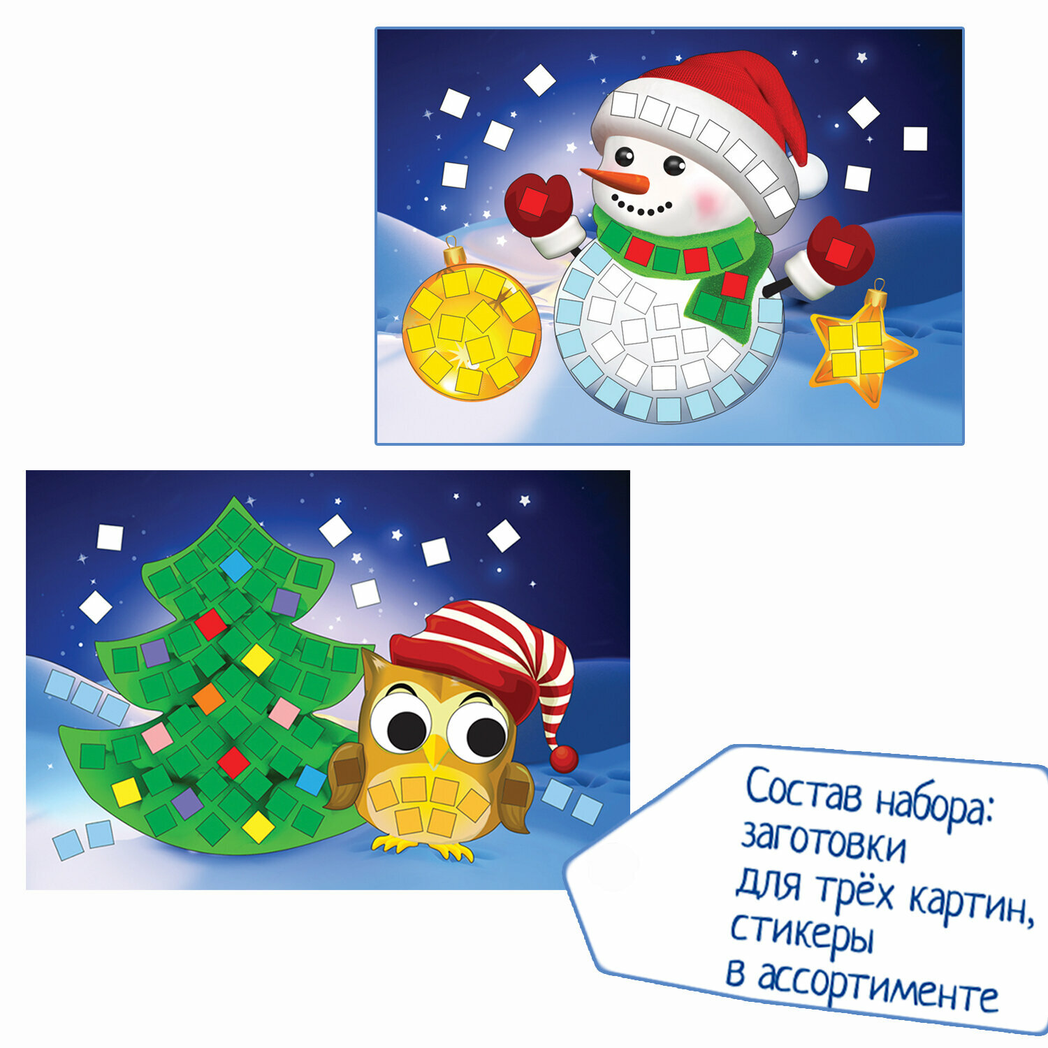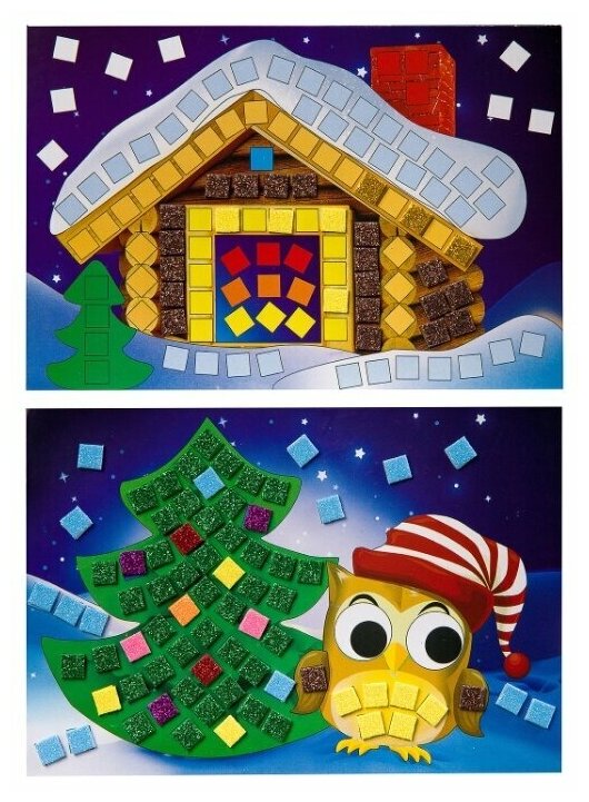 отличная яркая аппликация с искрящимися наклейками. формат картинки не большой. действительно не положили белый цвет. пришлось выкручиваться. часть выложили голубым из набора, часть белого (туловище снеговика) позаимствовали из другого. два квадратика жёлтого цвета так же не хватило, заменила их на темно-жёлтый в игрушке у совушки.