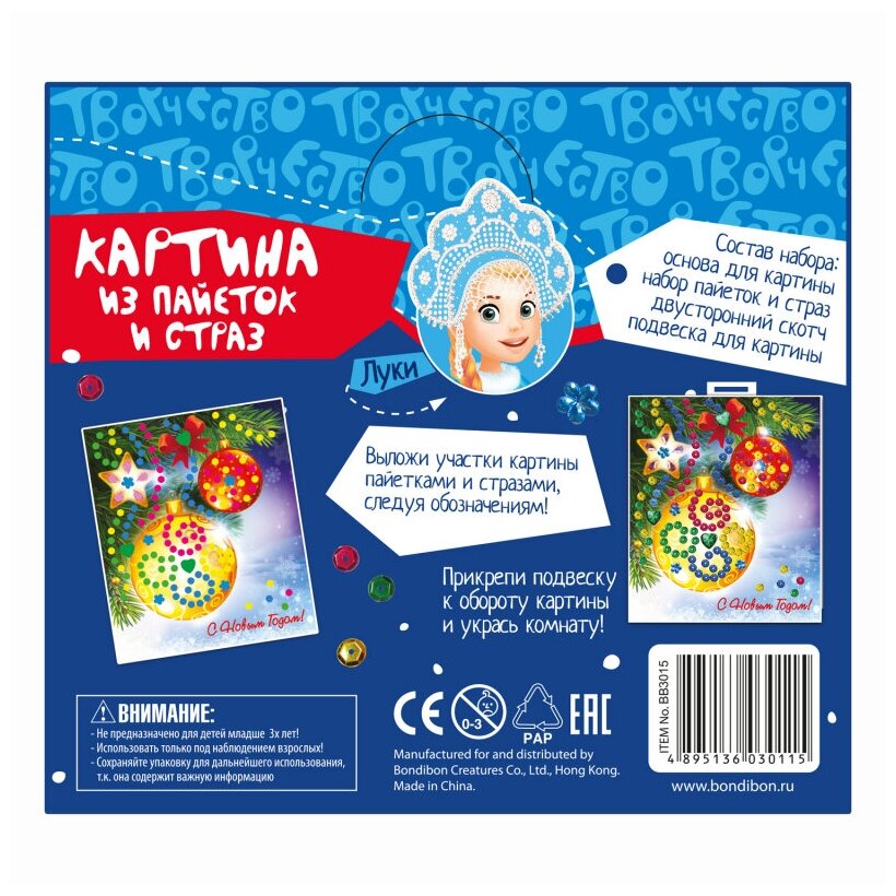 | Состав набора | основа для картины - 1 шт, набор пайеток и страз, двусторонний скотч - 1 шт, довеска для картины - 1 шт |