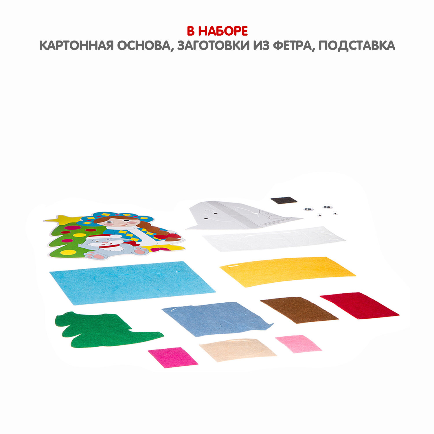 В наборе: картонная основа, заготовки из фетра, подставка.