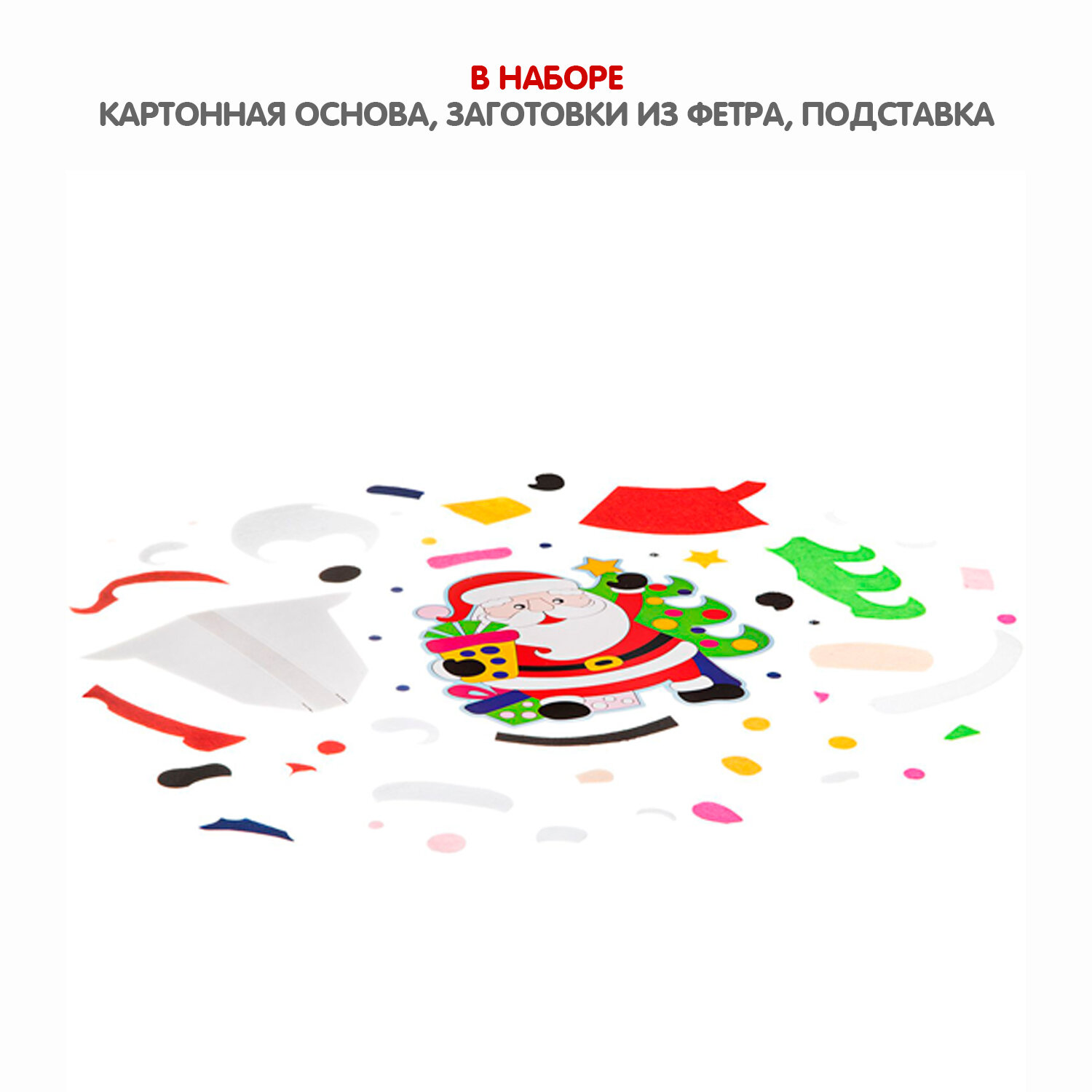 Набор для творчества - создание оригинального подарка своими руками. С помощью картонной основы с напечатанными рисунками и самоклеящихся деталей из фетра вы сможете смастерить красивый коллаж Деда Мороза. Использовав подставку из набора, украсить им свой интерьер!