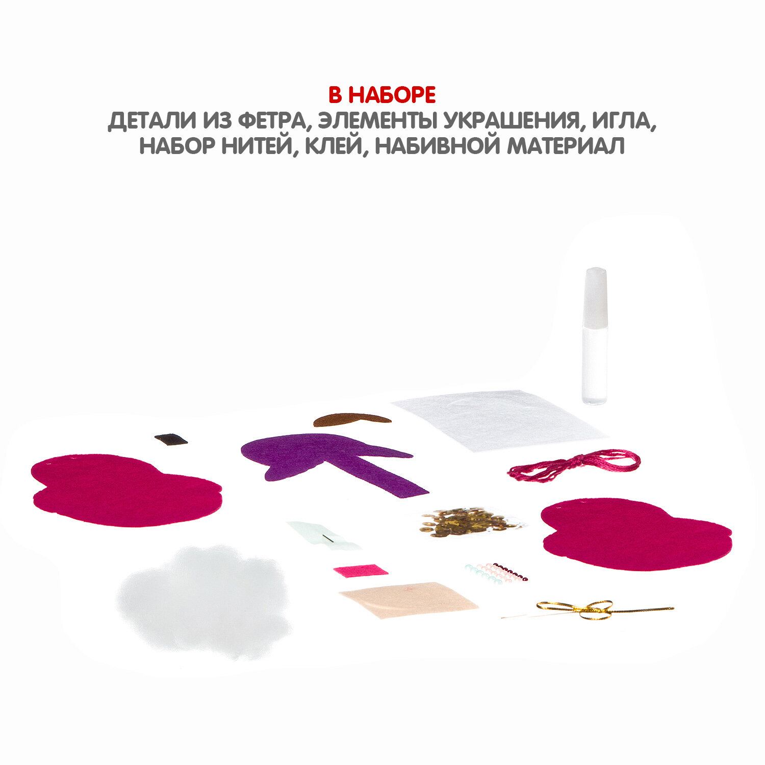 | Состав набора | детали из фетра, элементы украшения, игла - 1 шт, набор нитей, клей - 1 шт, набивной материал - 1 шт |
