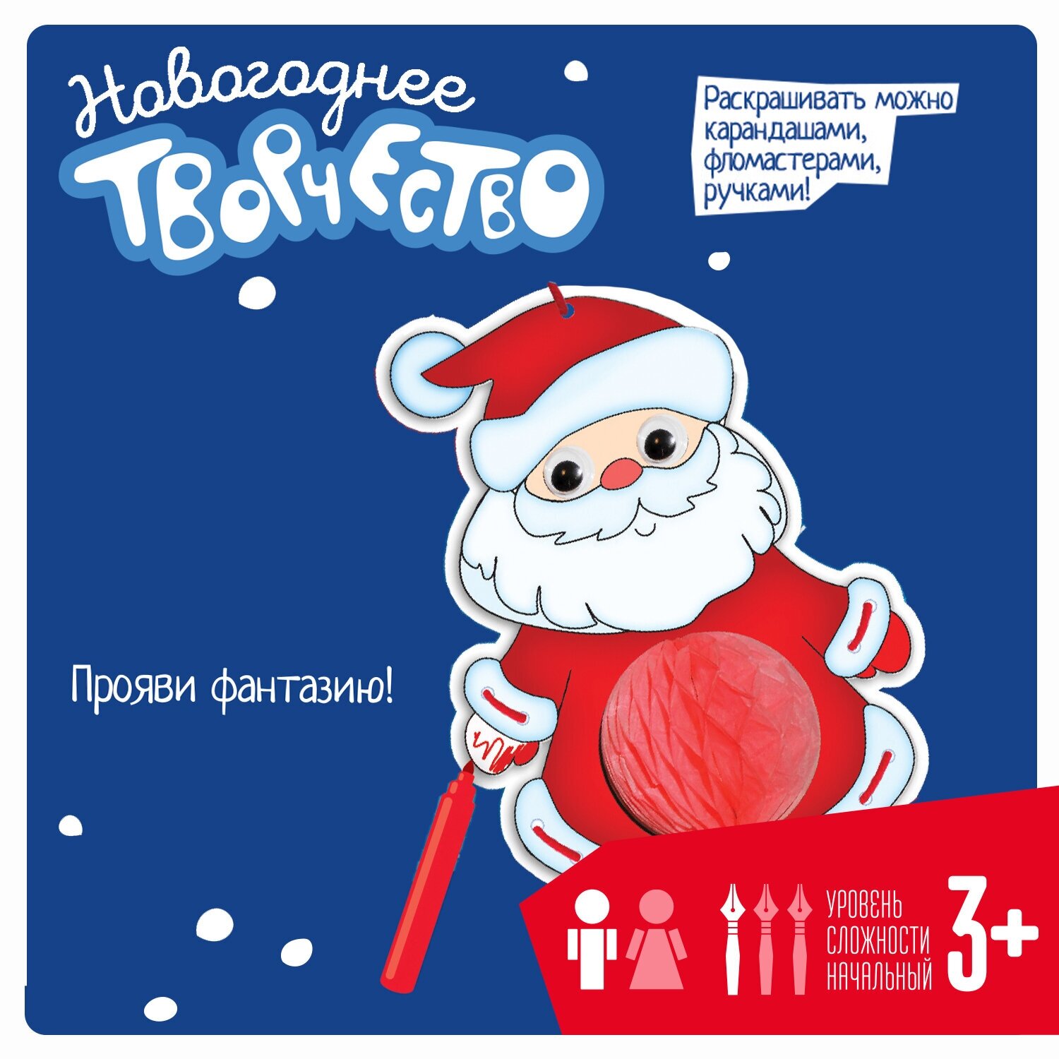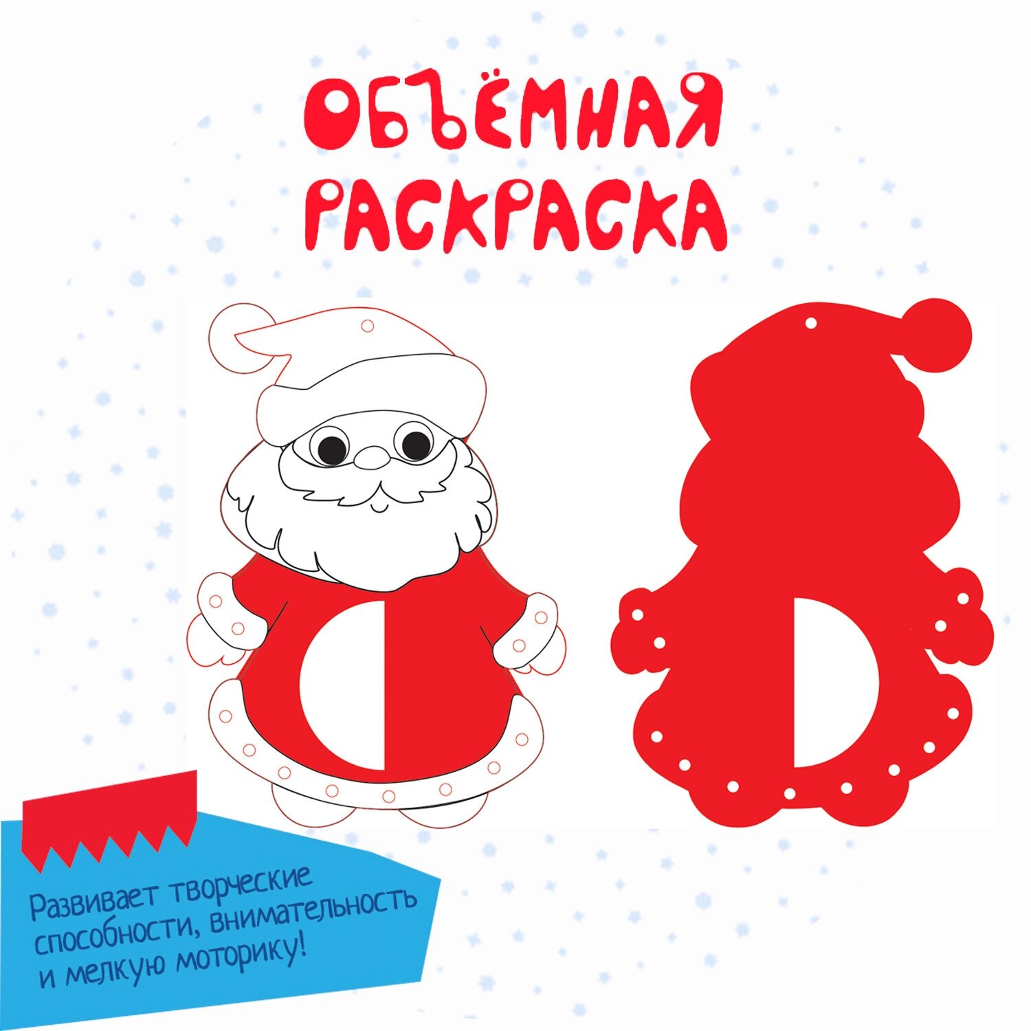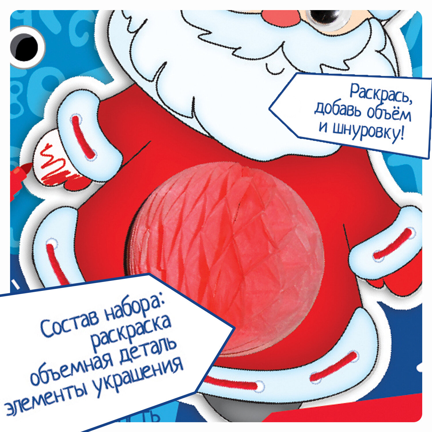 Новогодний набор с интересной раскраской и деталями, создающими объем. Раскрась изображение, добавь объемные детали и шнуровку. Набор развивает творческие способности, внимательность и мелкую моторику.