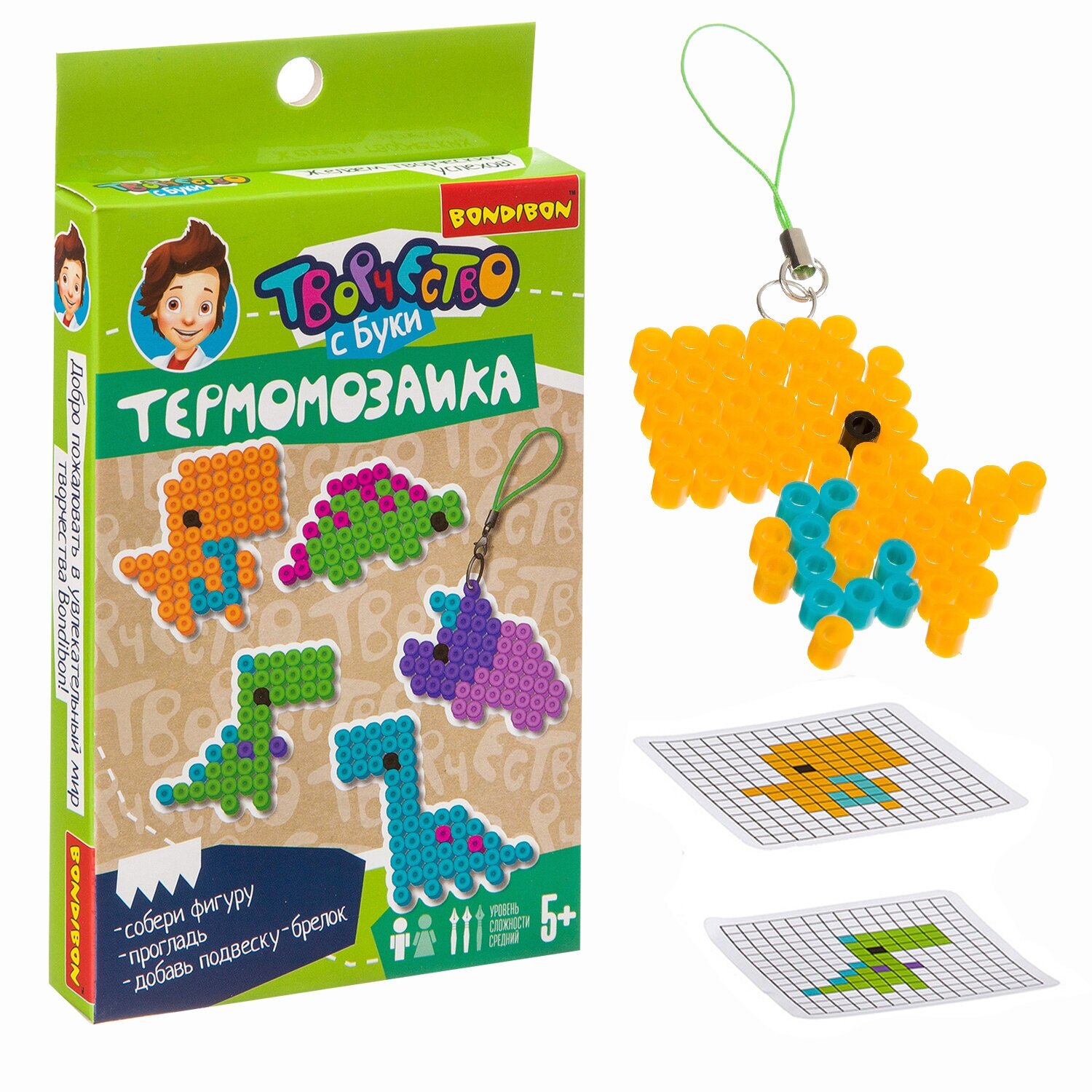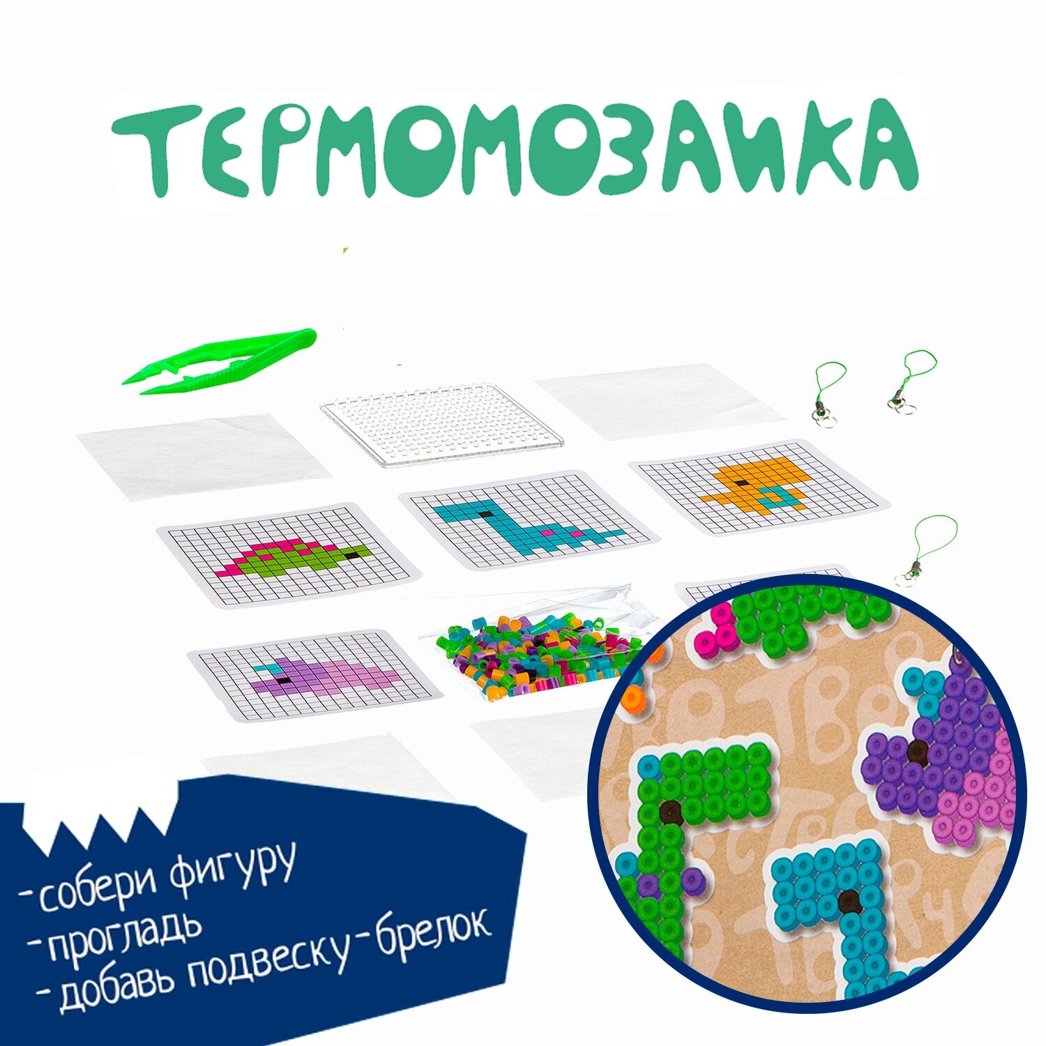 Термомозаика - увлекательный творческий набор. Из цветных пластиковых бусин создаются различные фигурки необычным путем. Фигурку необходимо собрать на форме-планшете и прогладить через кальку утюгом. Обработка горячим расплавит бусинки и скрепит их между собой. Фигурка остынет и с ней можно играть или сделать чудесную подвеску - брелок.