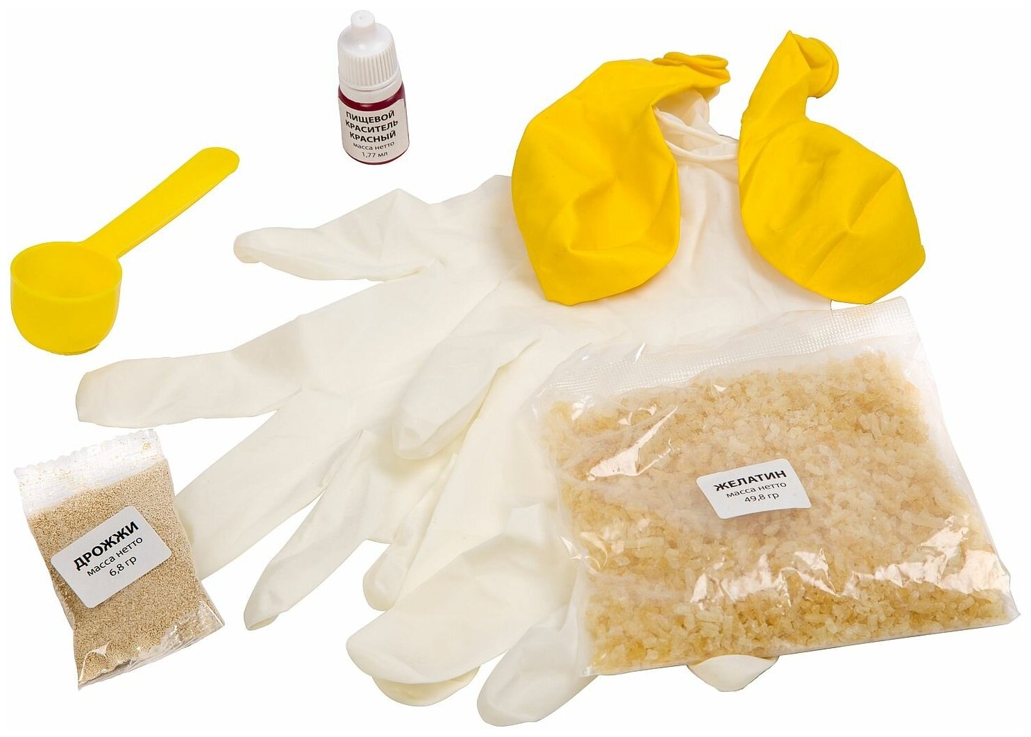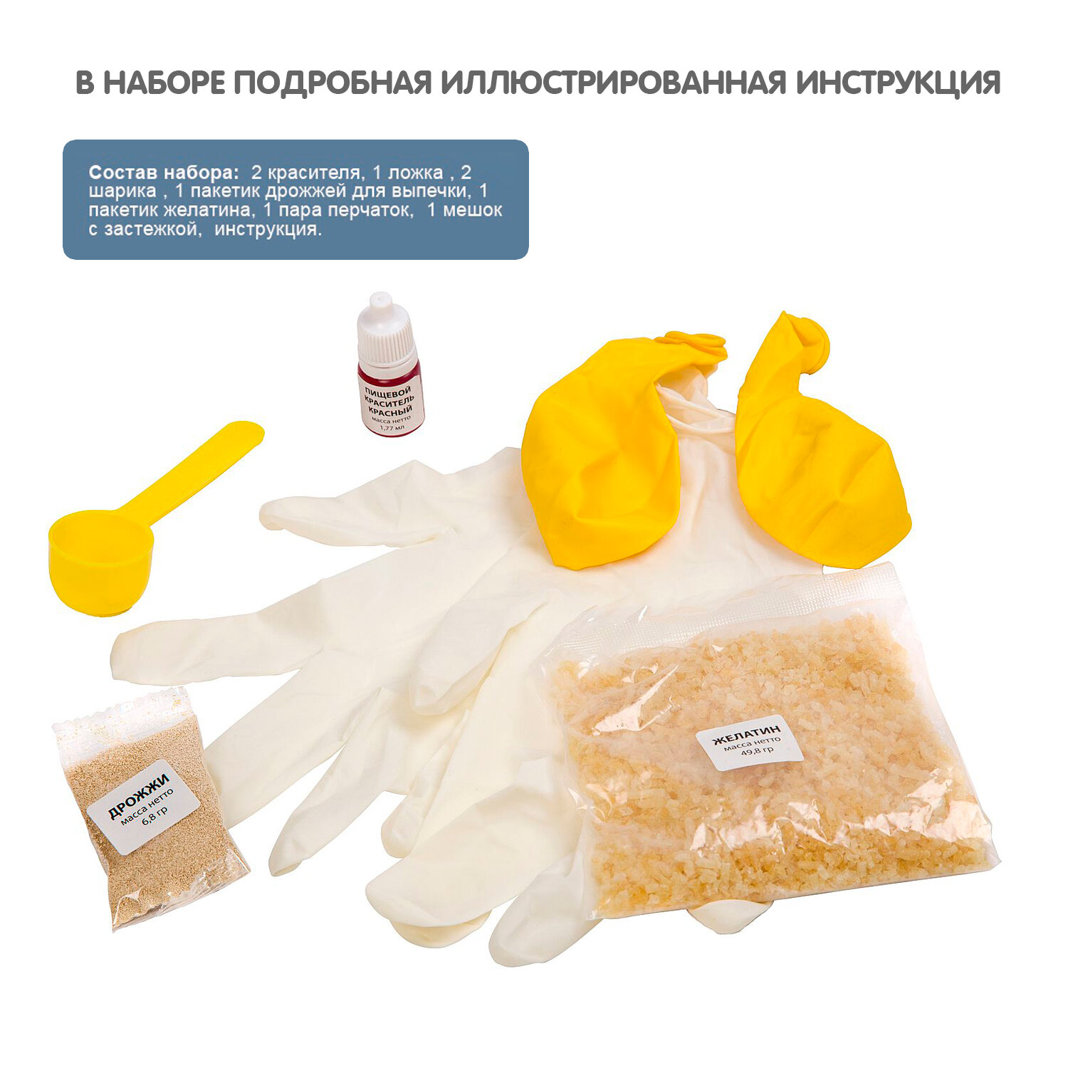 В наборе: 2 красителя, 1 ложка, 2 шарика, 1 пакетик дрожжей для выпечки, 1 пакетик желатина, 1 пара перчаток, 1 мешок с застежкой, инструкция.
