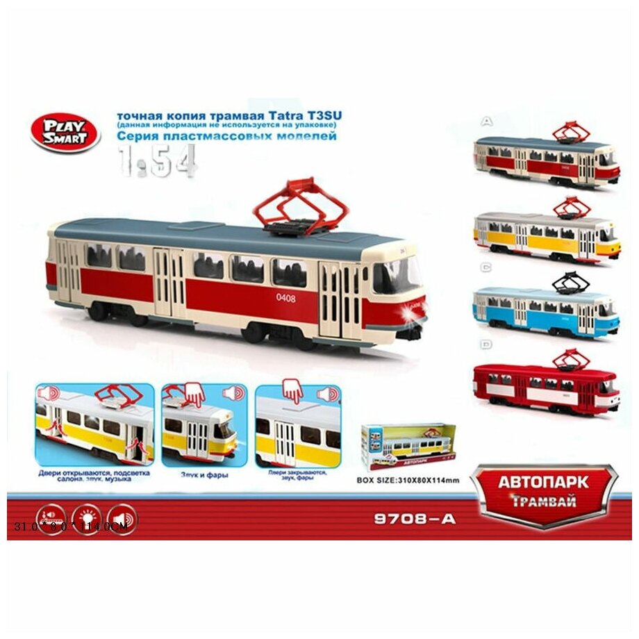 Этот трамвай является уменьшенной копией трамваев Tatra T3SU, производившихся в Праге и поставлявшихся в СССР начиная с 1960 года. Эта игрушка оснащена инерционным механизмом, кроме того, у трамвая могут открываться двери и загораться фары. При нажатии на крышу срабатывает звуковой механизм: вы услышите объявление об остановке, предупреждение о том, что двери закрываются, или трамвайный звонок.