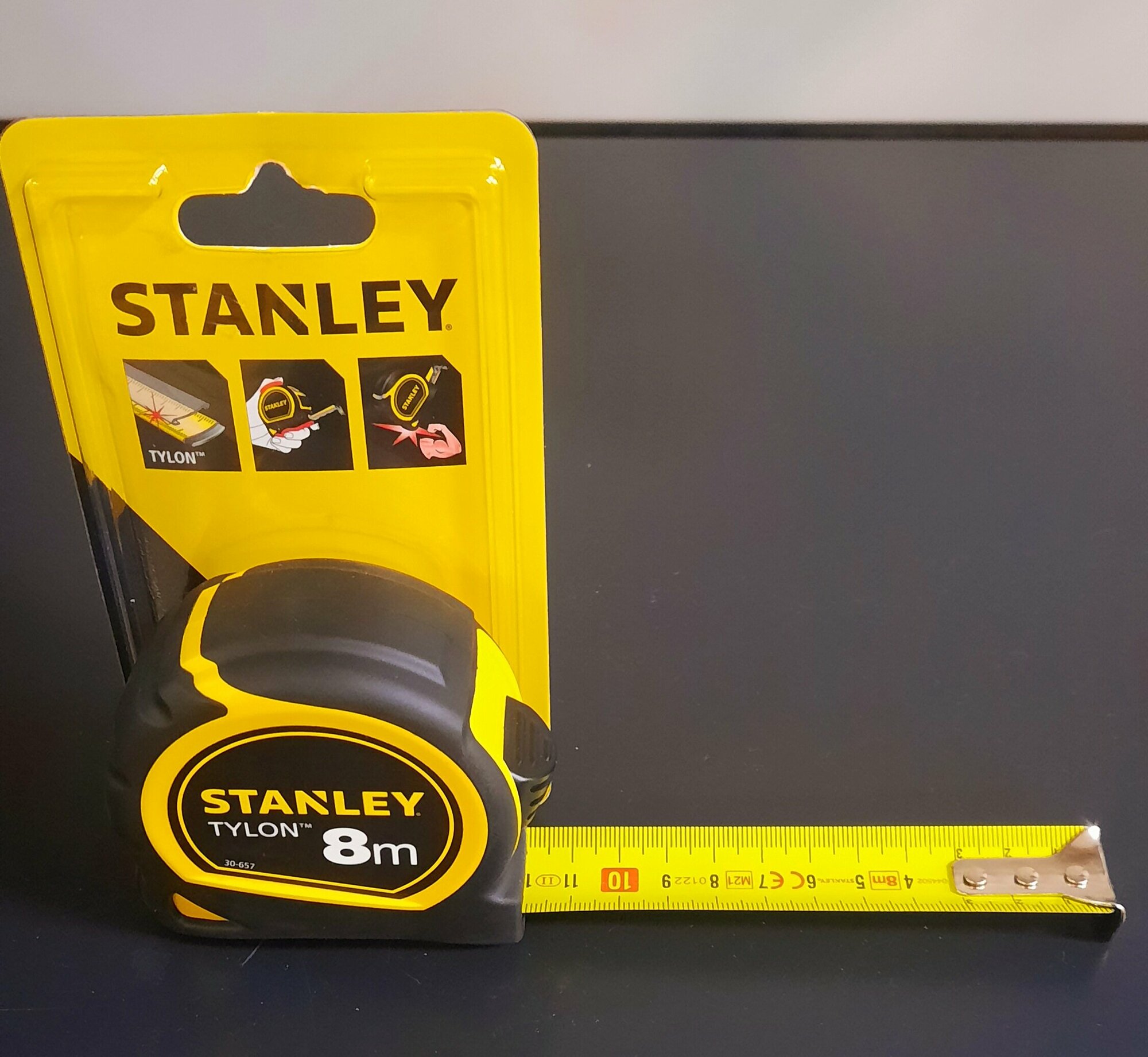 Покупал Стенли тут, мне всегда нравилась эта фирма, и когда пришла в негодность старая рулетка, сразу знал, какую брать. Модель Tylon мне посоветовал продавец - она популярная, надежная и на 8 м. Корпус из пластика, но прорезинен - не боится падений или ударов, внутри рулон металлический, не ржавеет, но краска на нем быстро протирается (особенно по краям). Фиксация на нужном отрезке есть, надежная и легко выдвигается, имеется крючок для внутренних измерений и даже зажимы для поясного крепления. Точность высокая - делал дома ремонт и ни разу ни в чем не ошибся, ширина ленты стандартная - 25 мм.
