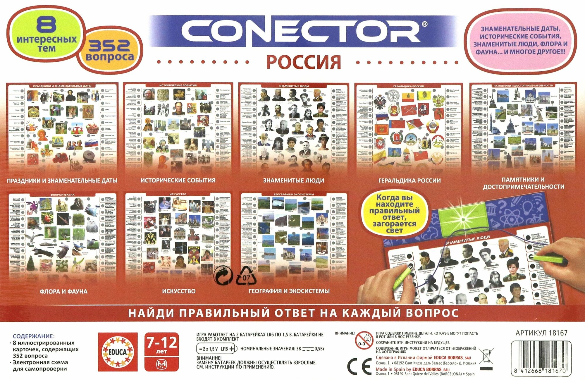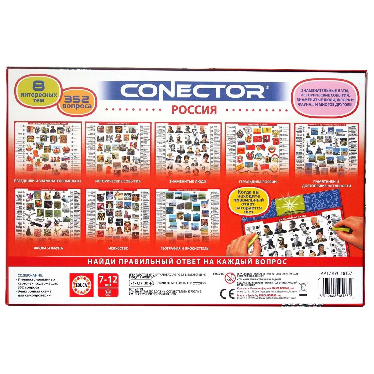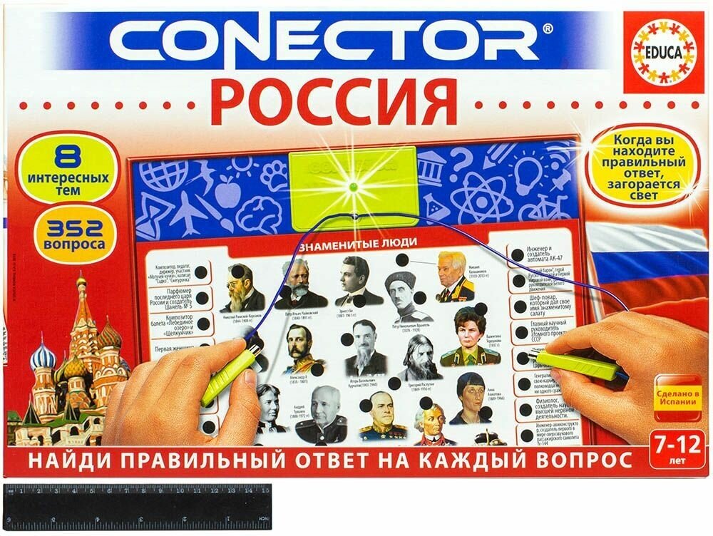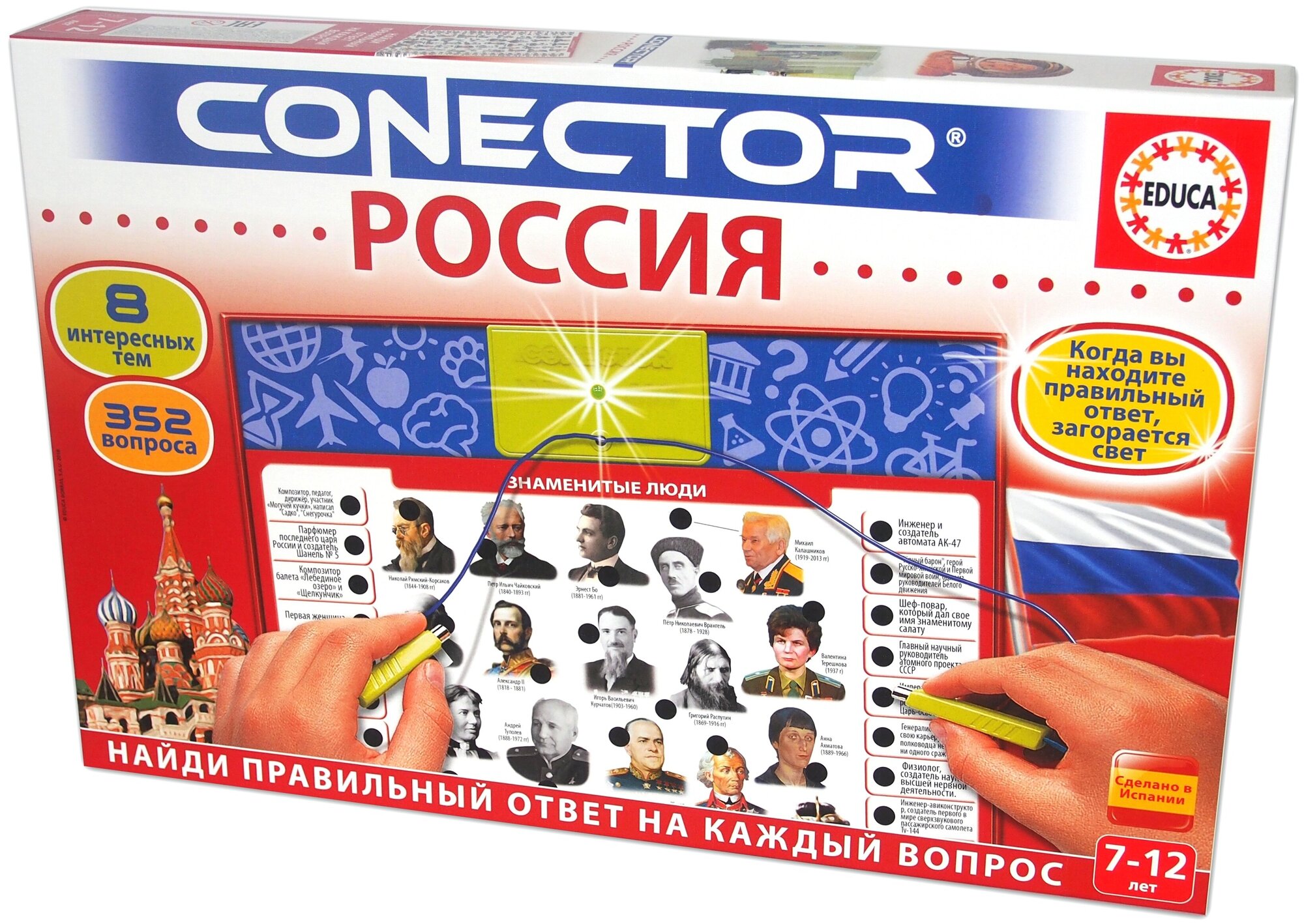 Электровикторина Educa "Россия" - это увлекательная игра в формате вопрос- ответ, которая поможет ребенку узнать много новой информации о России. Игра предназначена для детей от 7 до 12 лет. С помощью электровикторины ребенок познакомится такими темами как: знаменательные даты, исторические события, знаменитые люди, флора и фауна, праздники, геральдика, памятники и достопримечательности, искусство, география и экосистемы.