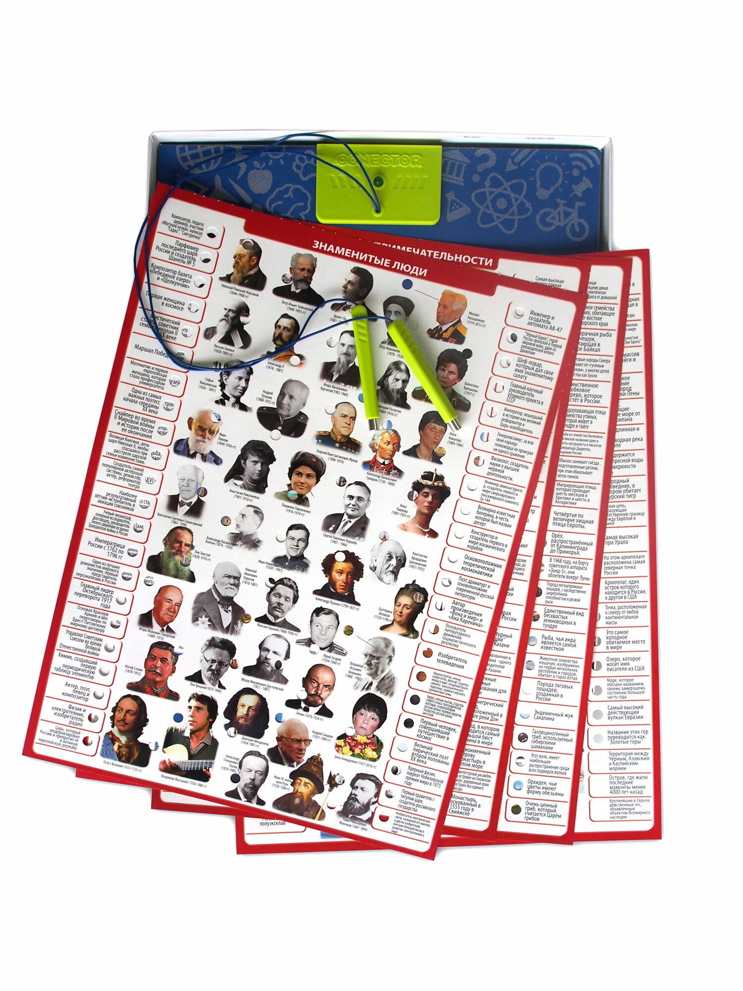 В комплект входит: 8 иллюстрированных карточек содержащих 352 вопроса на разные темы, электронная схема для самопроверки, инструкция к игре. Инструкция очень простая, любой ребенок разберется без труда.