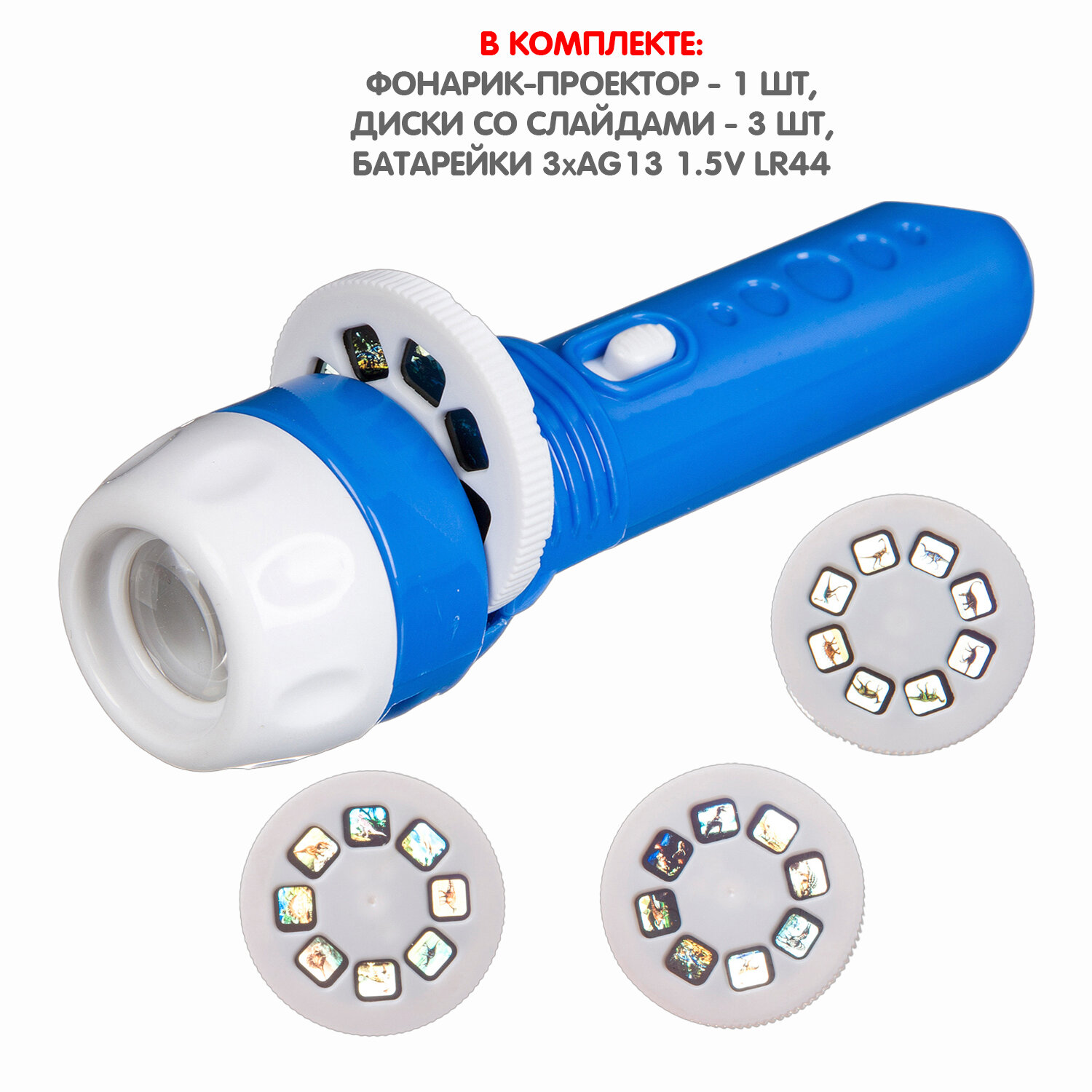 В наборе: фонарик-проектор, диски со слайдами (3 штуки), батарейки AG13 (3 штуки).