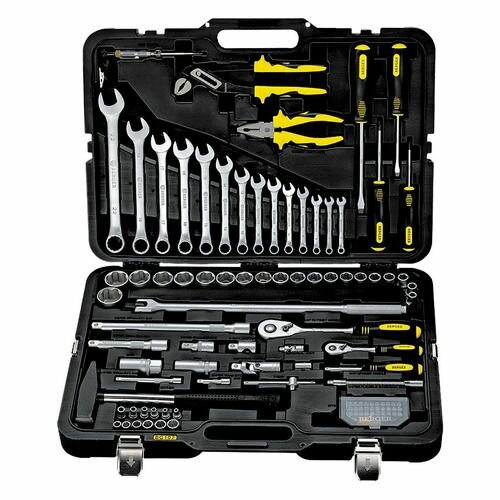Набор из 102 предметов, включающий в себя гаечные ключи, отвертки и торцевые головы. Все элементы выполнены из высокопрочной стали с покрытием, защищающим от коррозии. Для хранения и транспортировки в комплектацию входит кейс, внутри которого производится надежная фиксация всех включенных инструментов.
