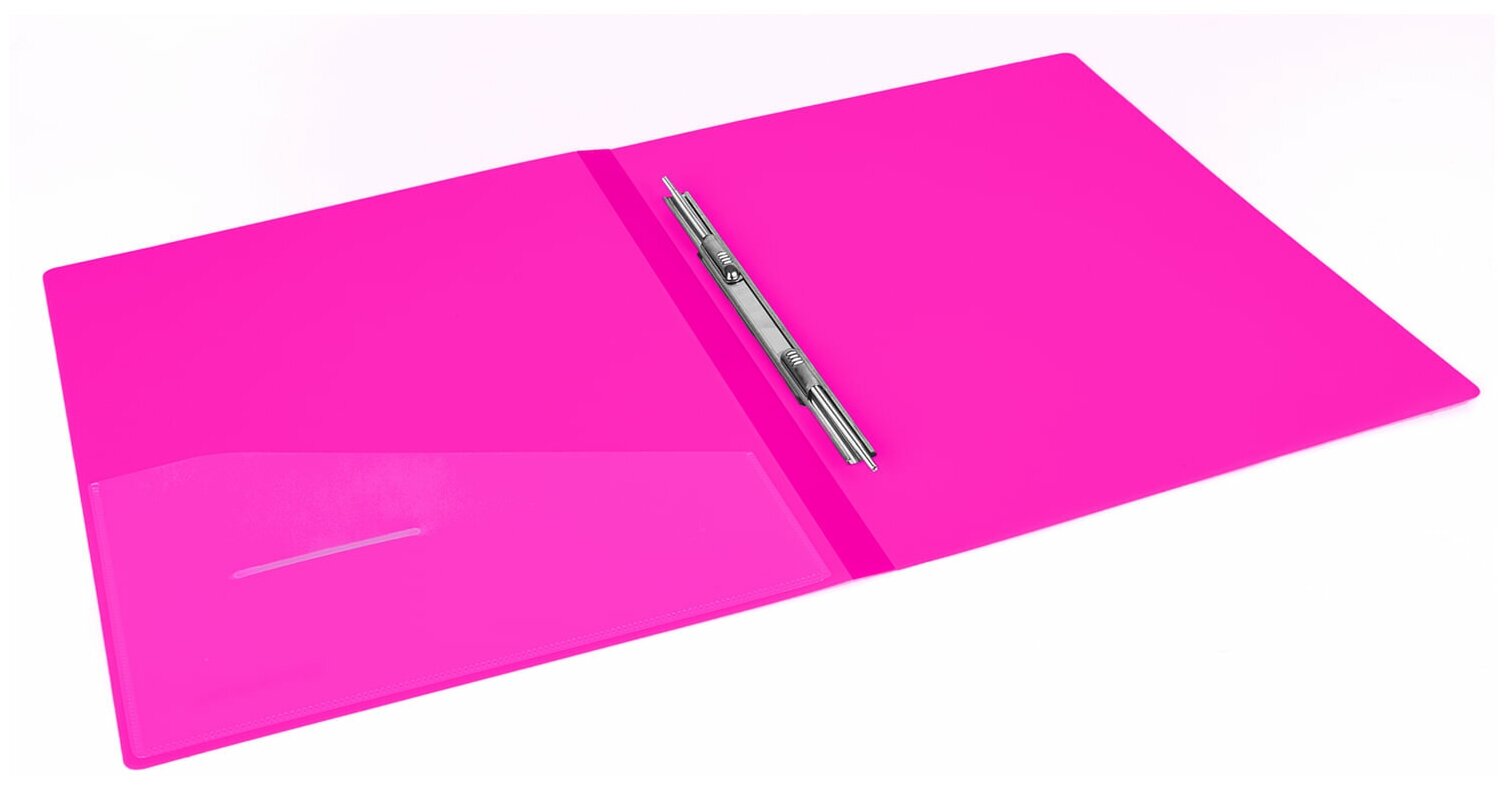 Папка с металлическим пружинным скоросшивателем, неоново-розового цвета, предназначена для хранения перфорированных документов. Папка изготовлена из плотного непрозрачного пластика.