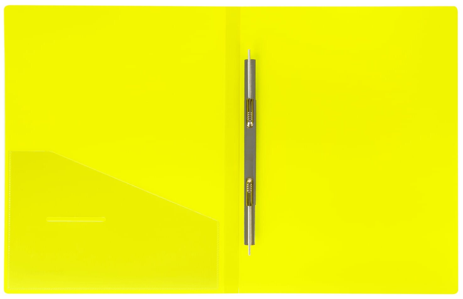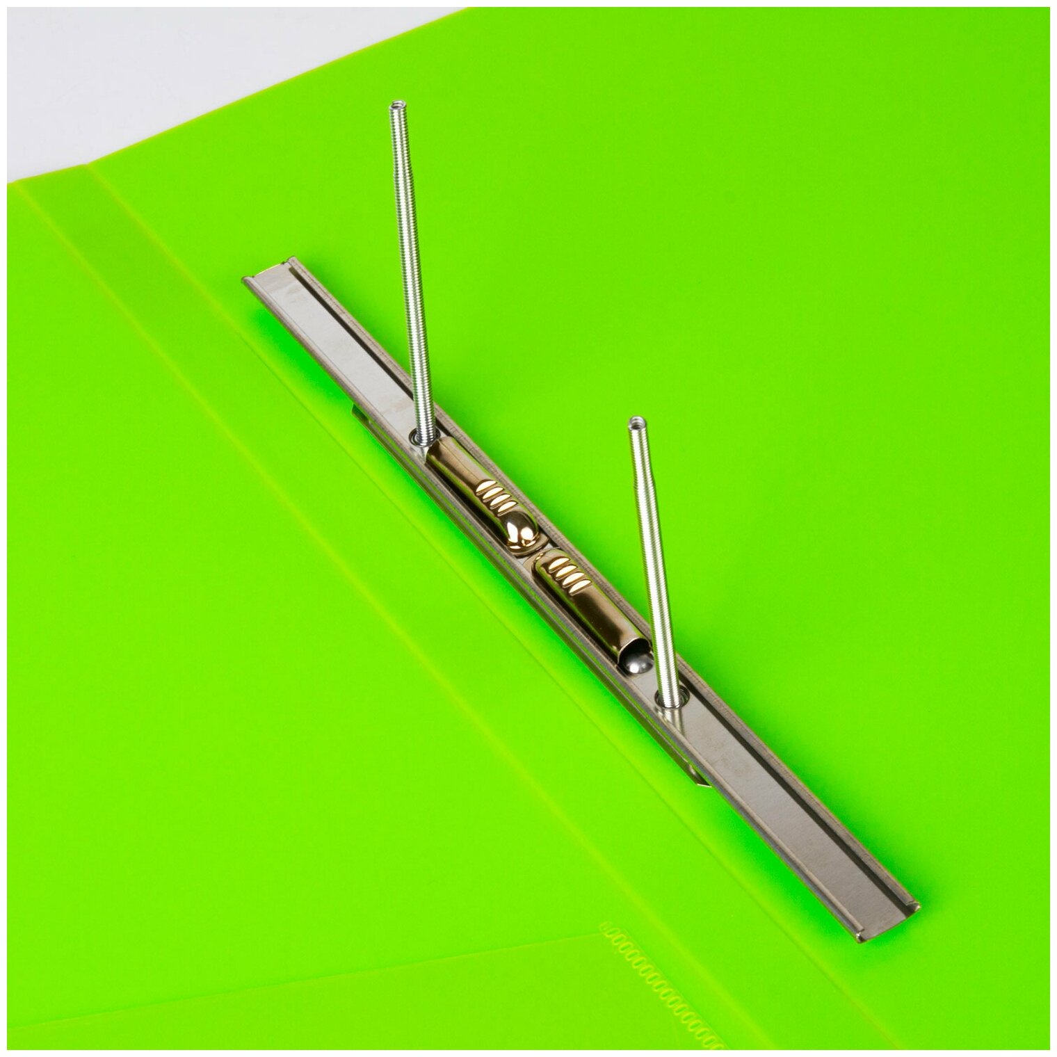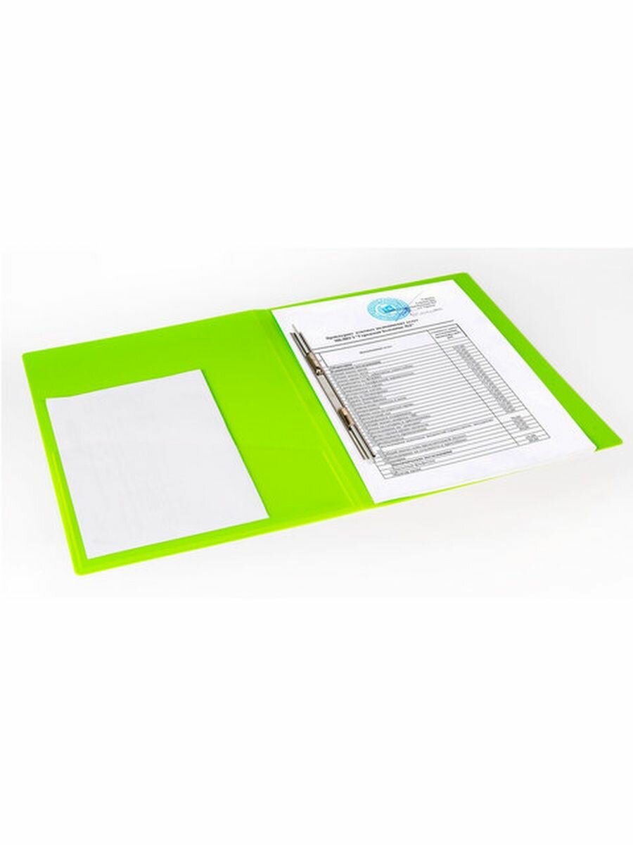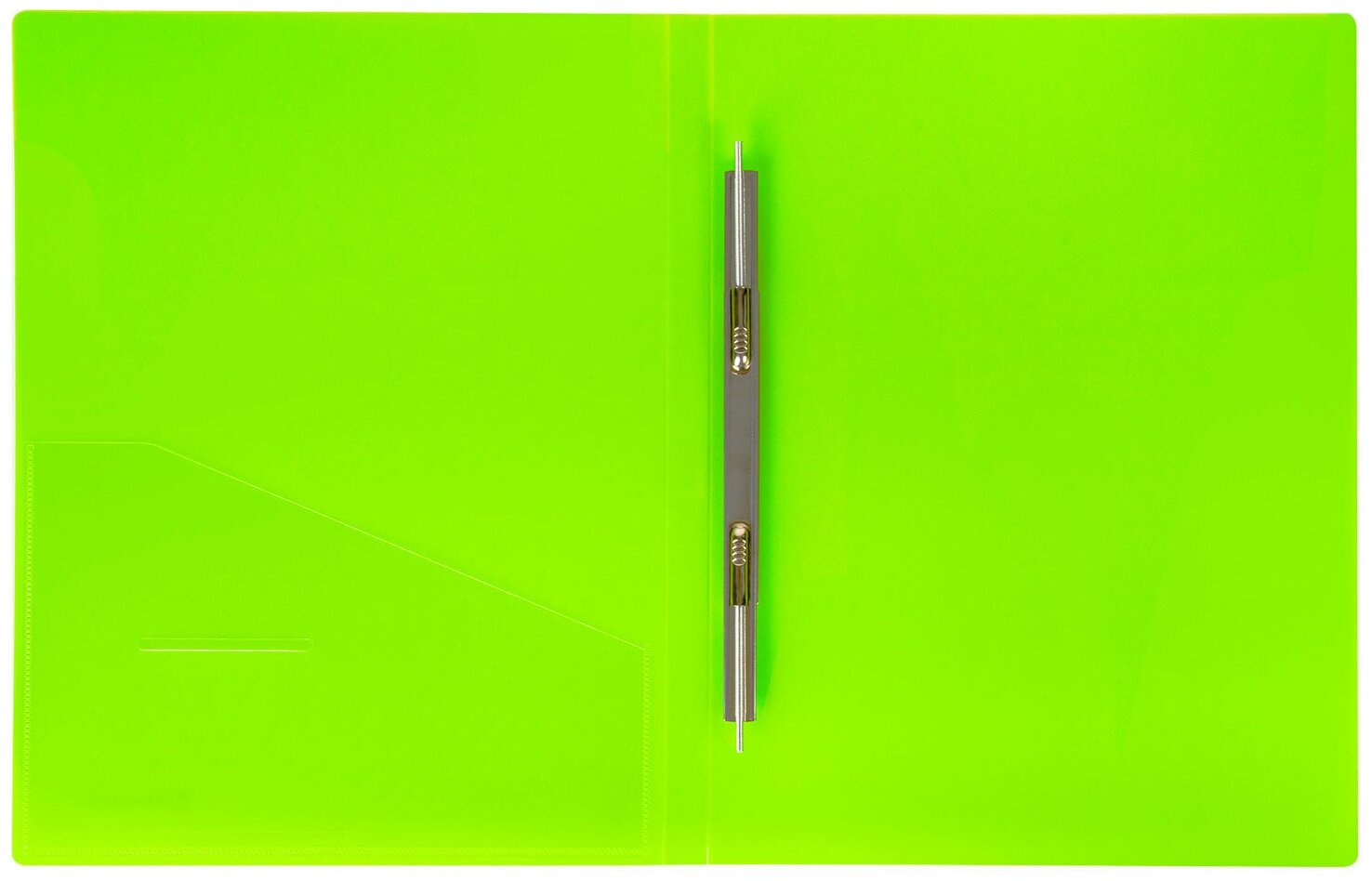 Папка с металлическим пружинным скоросшивателем, неоново-зеленого цвета, предназначена для хранения перфорированных документов. Папка изготовлена из плотного непрозрачного пластика.