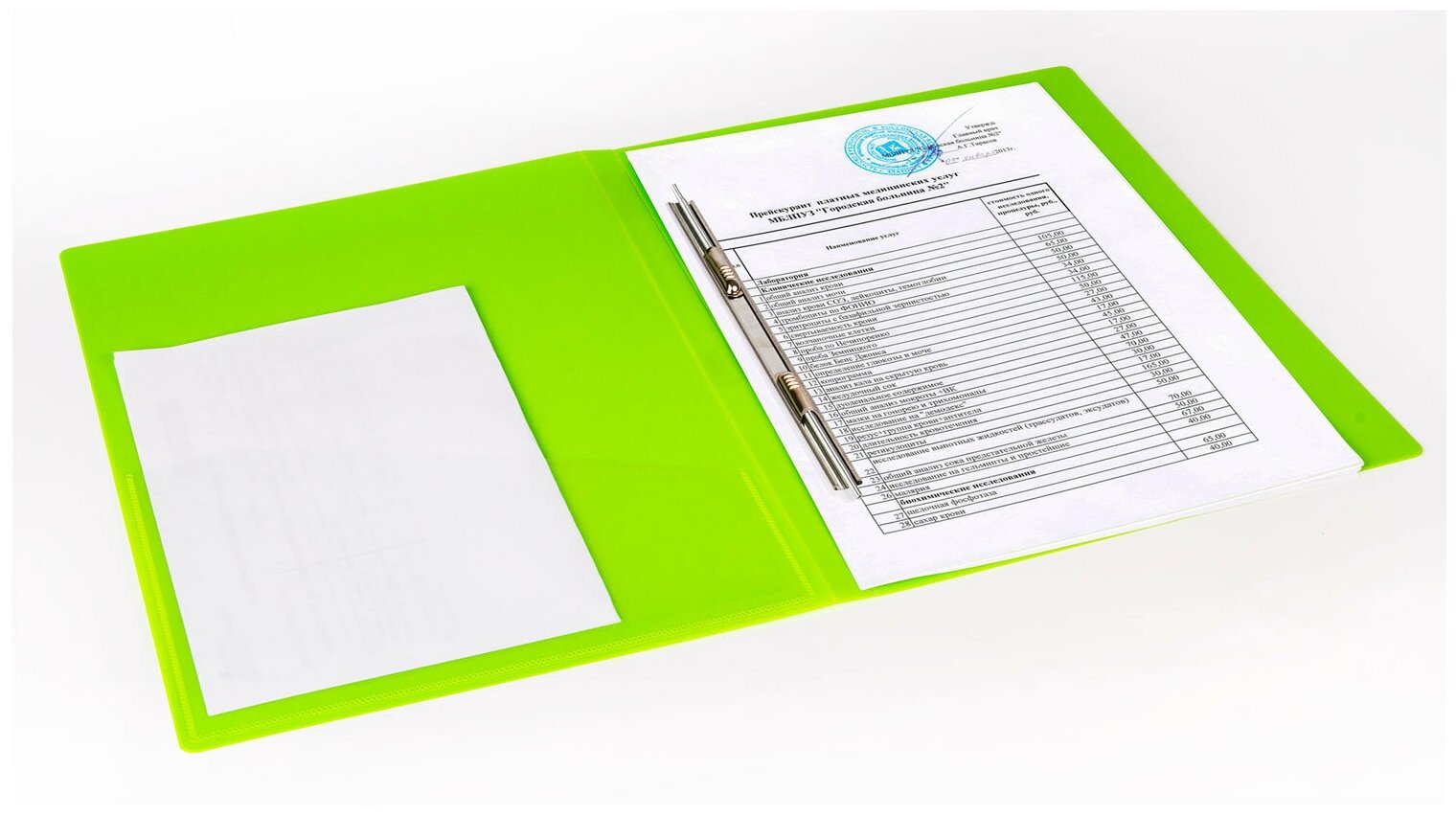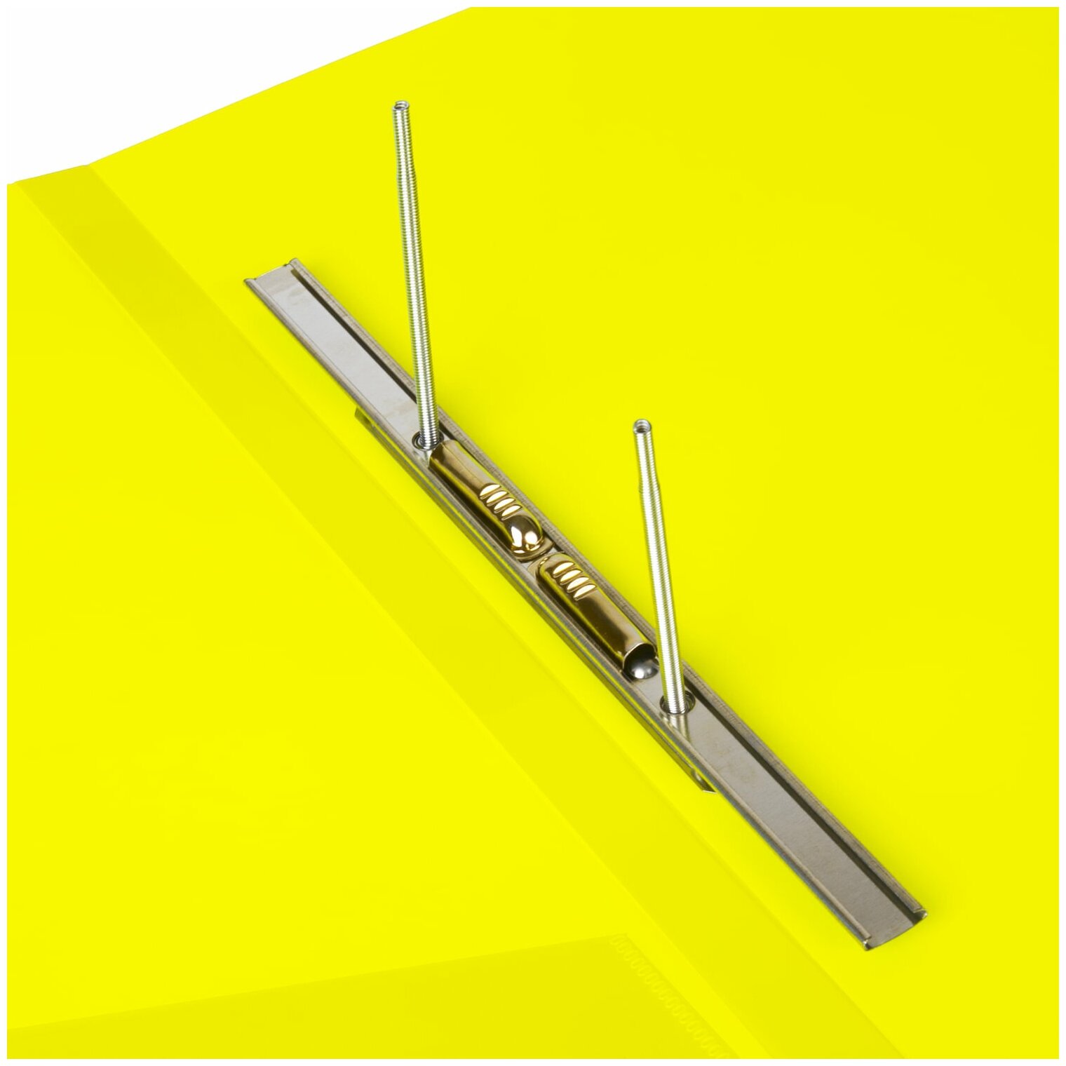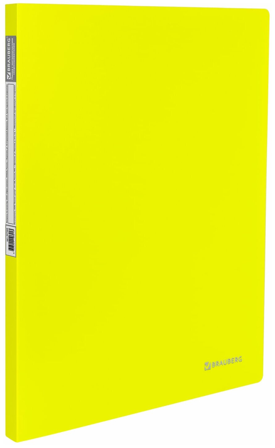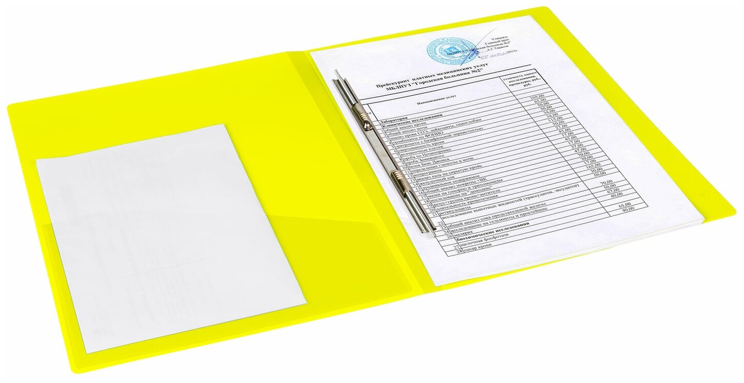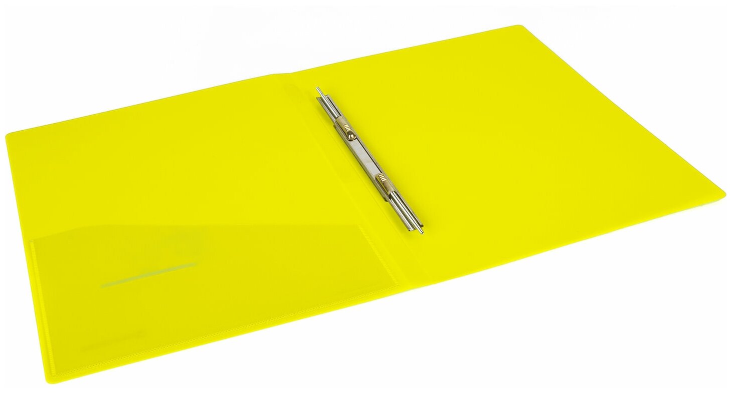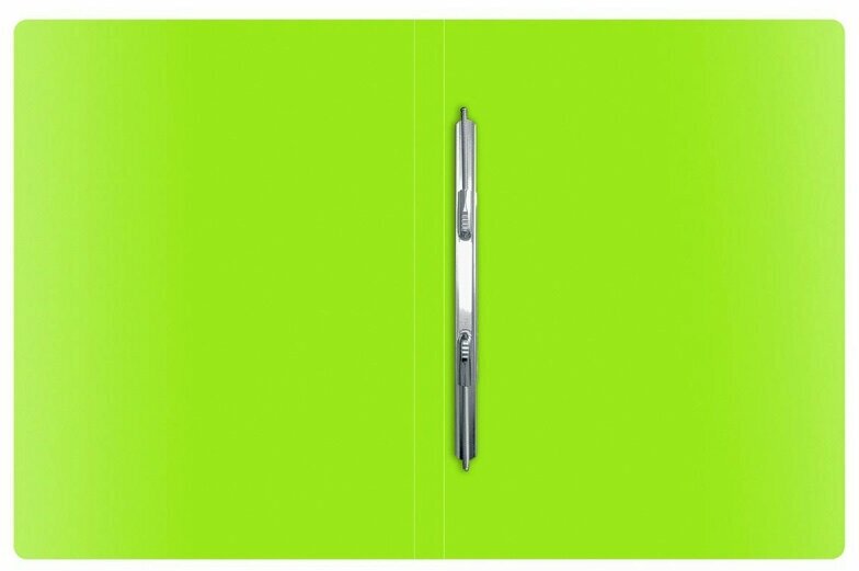 Папка с металлическим пружинным скоросшивателем, неоново-зеленого цвета, предназначена для хранения перфорированных документов. Папка изготовлена из плотного непрозрачного пластика.