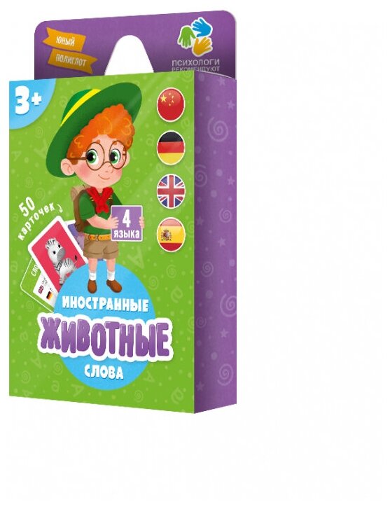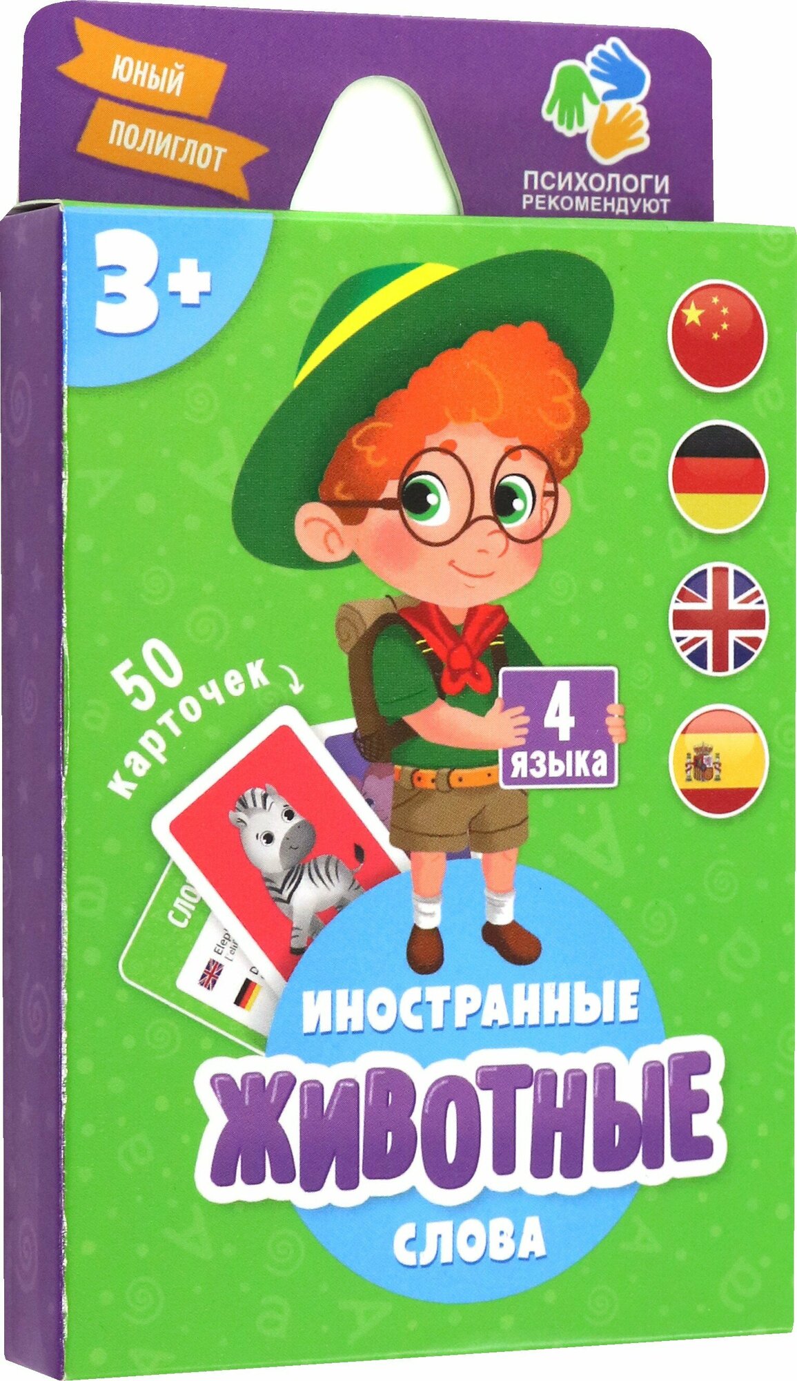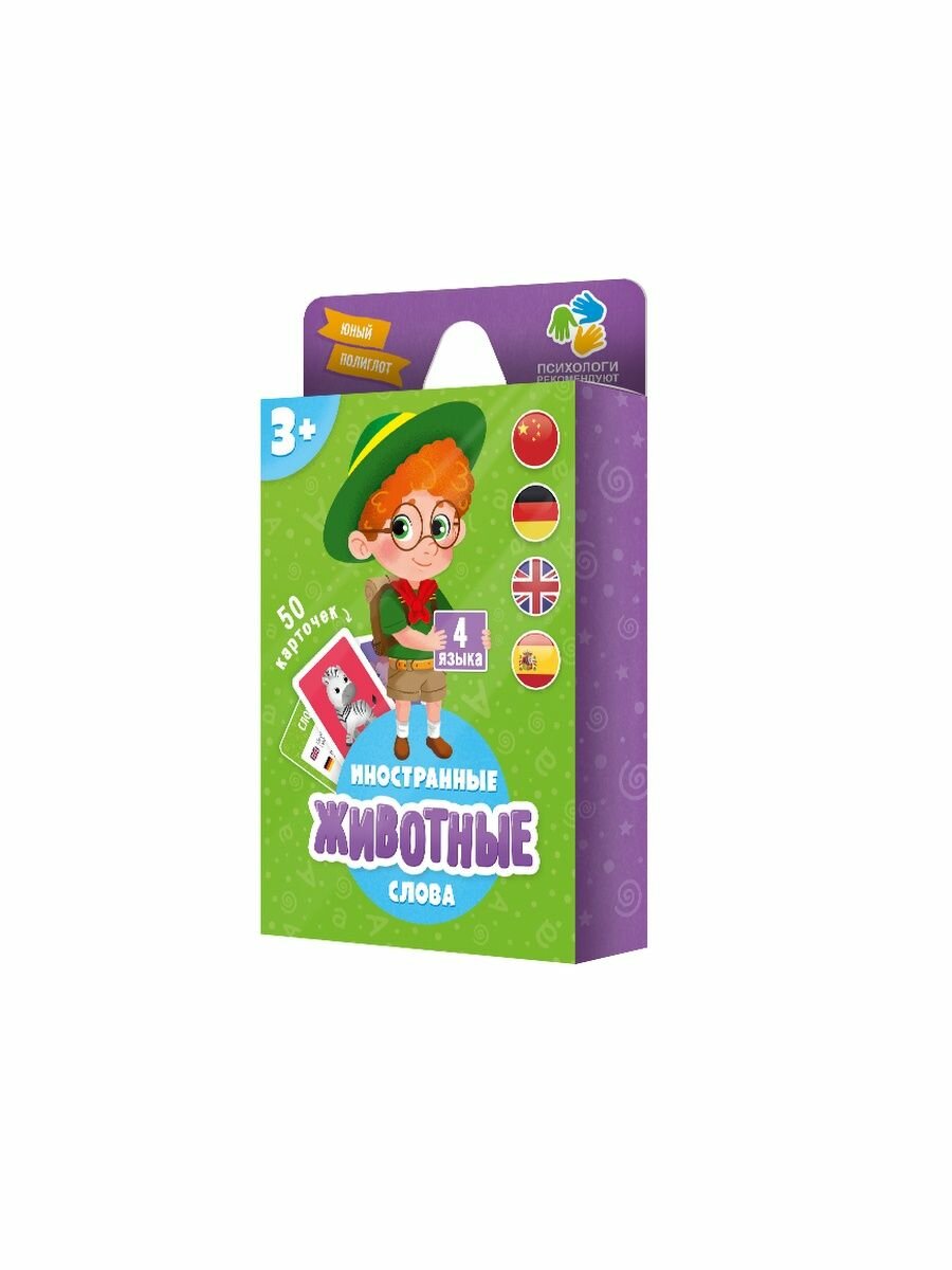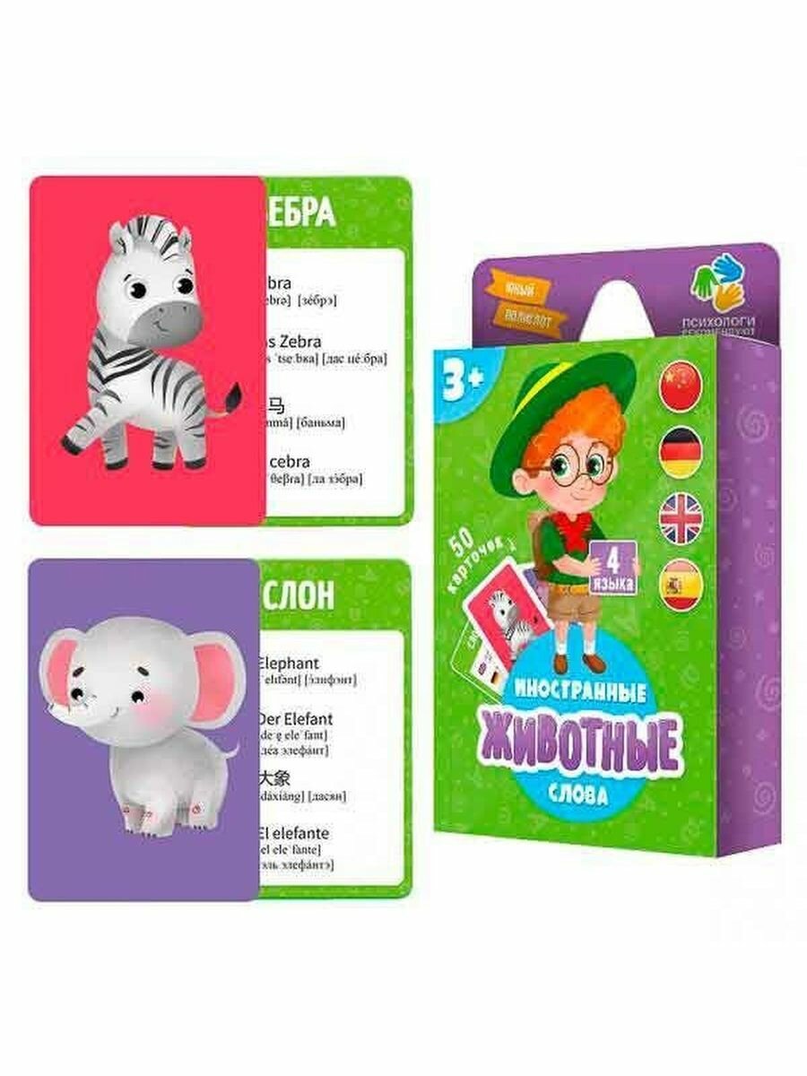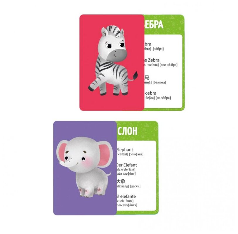 Отличная игра!!! Благодаря простой транскрипции легко прочитать любое слово на любом из четырех языков!Яркий цветной фон, на котором изображены животные, привлекает внимание ребенка. Достаточно обширный диапазон животных-домашние, лесные, морские, африканские, насекомые... Помимо изображений животных несколько карточек с прилагательными, характеризующими в той или иной степени характер животного. Карточки изготовлены из картона, углы скруглены. Отличный набор! Рекомендую!