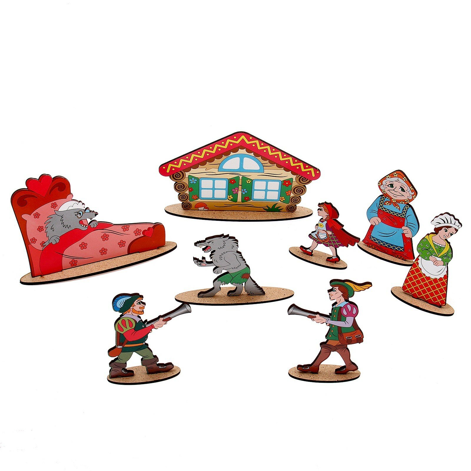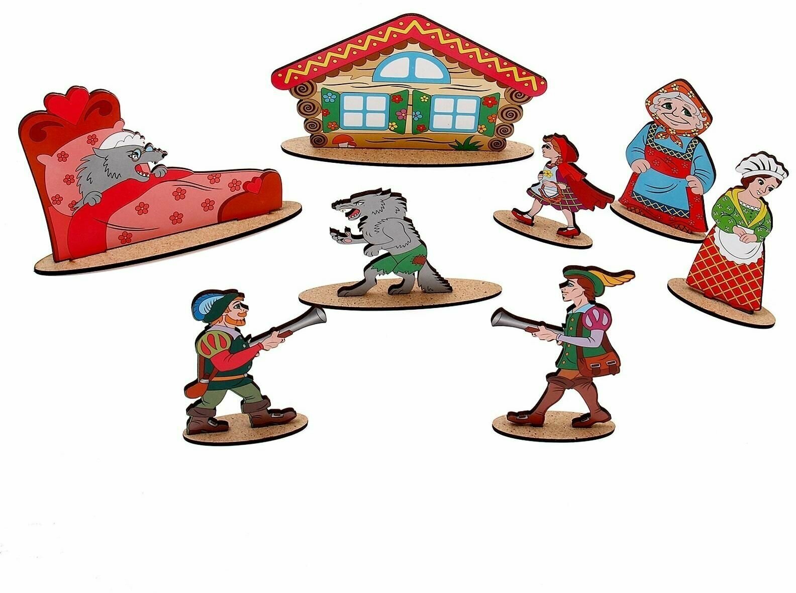 Задумка отличная! Но исполнение оставляет желать лучшего.... Фигурки очень тяжело вставляются в пазы. На некоторых деталях пазы не совпадают вовсе. У Красной Шапочки сразу же отломали ногу, пытаясь вставить её на подставку. Конечно, все эти нюансы были исправлены с помощью клея и ножа, но неприятно. В книжке, кстати, пропущена строка и дровосеки почему-то с ружьями.