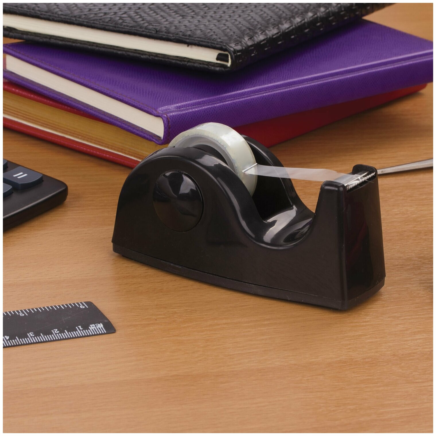 Утяжеленный диспенсер классической формы. Снабжен стальным ножном для отрезания ленты. Предназначен для канцелярских клейких лент любого типа шириной до 26 мм. Основание с нескользящим покрытием.