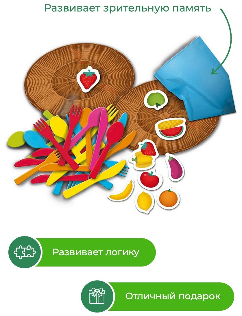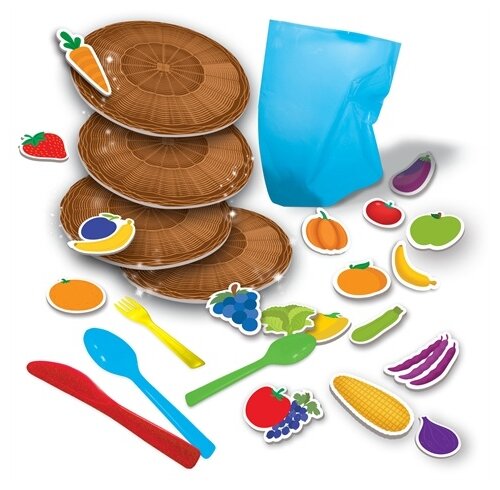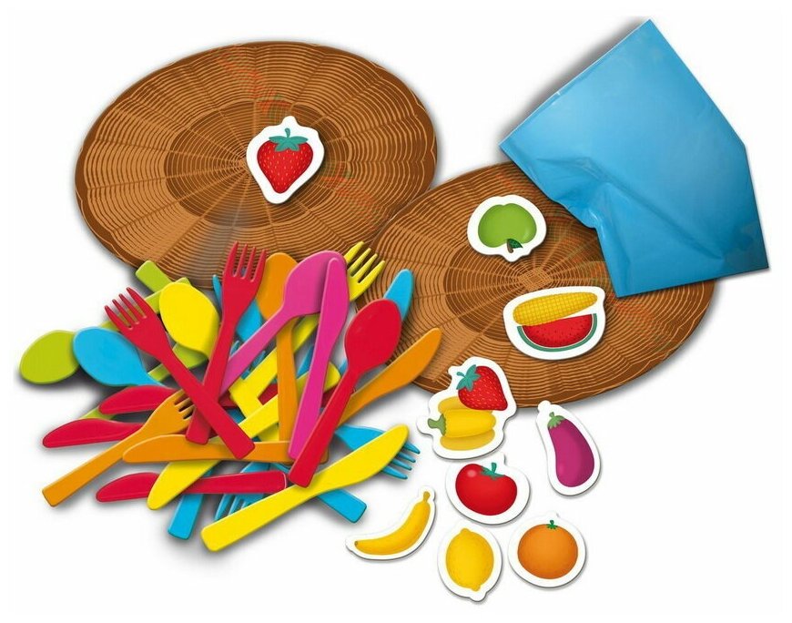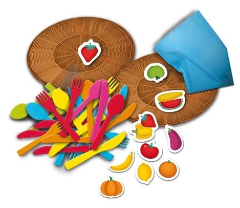 Состав набора: 4 корзины, 32 карточки с продуктами, 36 пластиковых столовых приборов, пластиковый мешок.