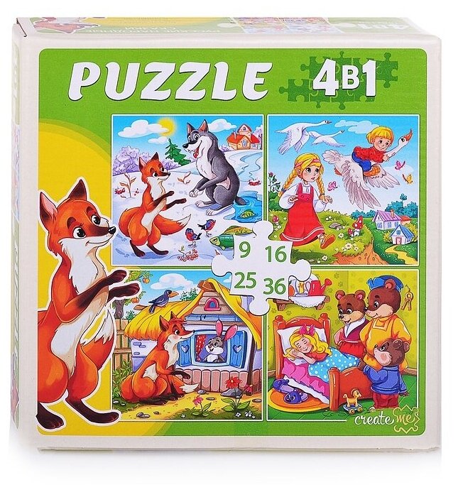 В комплекте 4 пазла с 9, 16, 25 и 36 элементами.