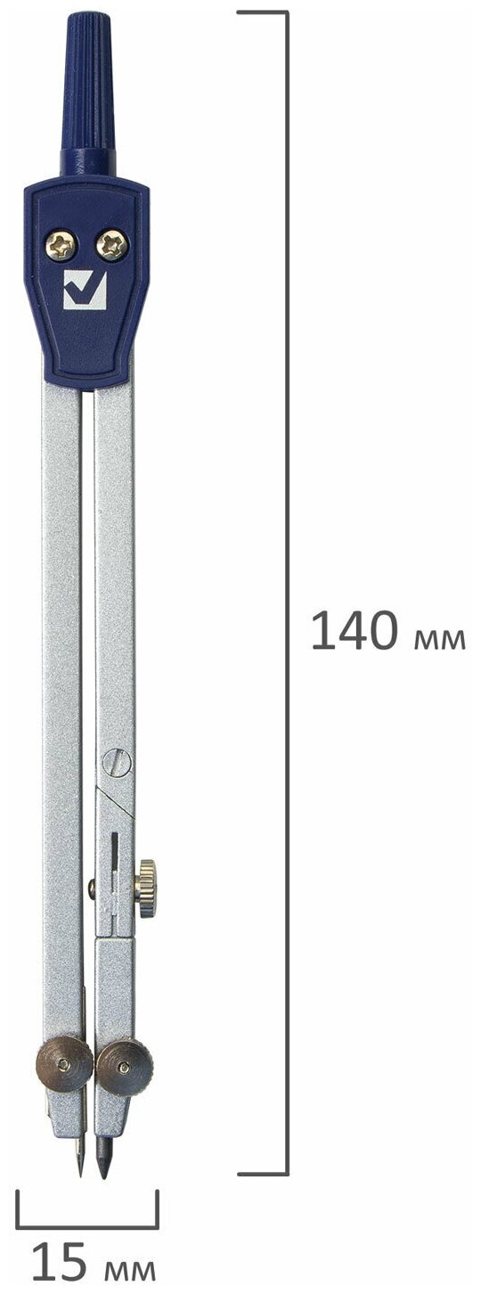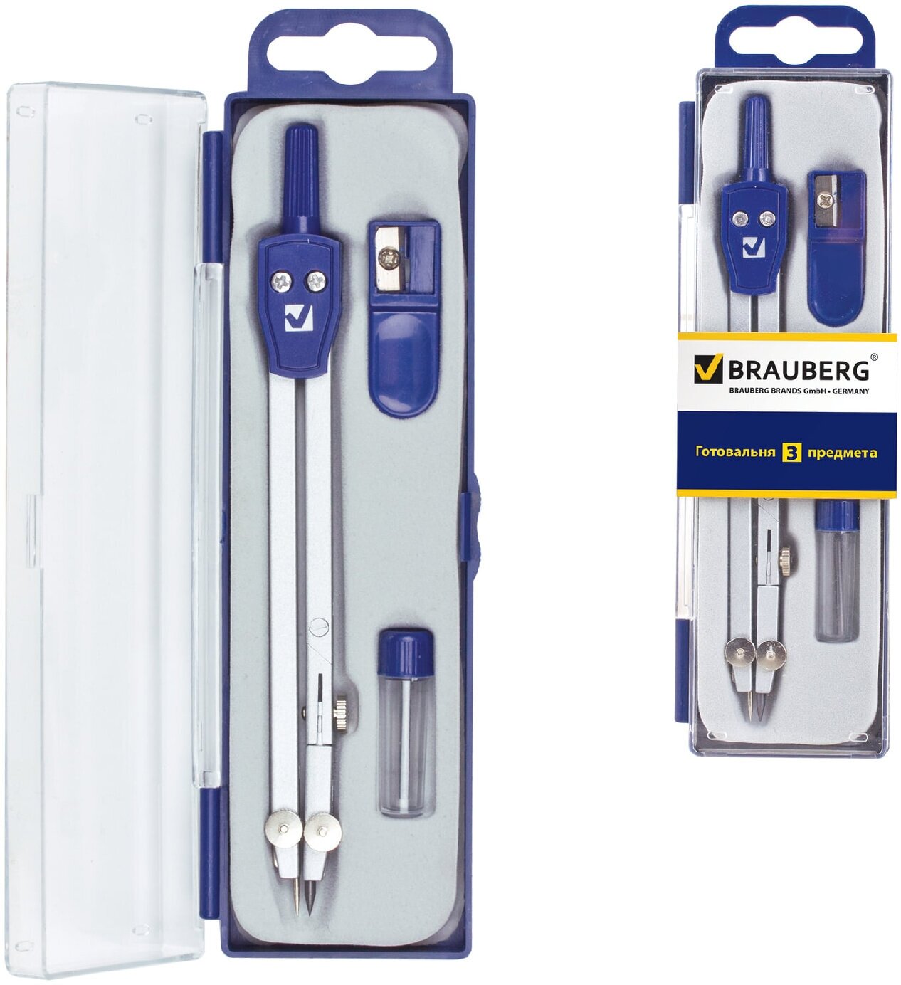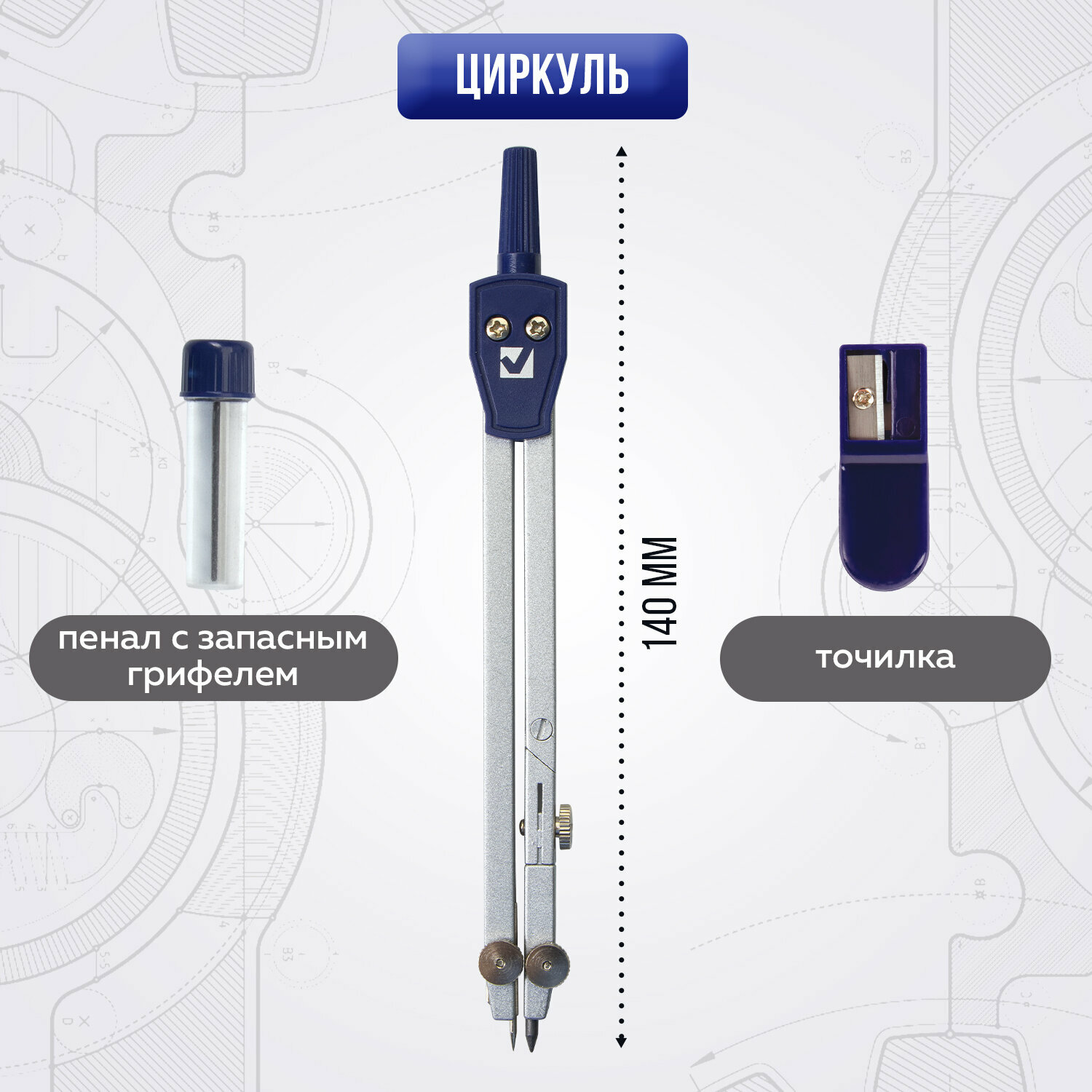Количество предметов: 3 (циркуль 140 мм с одной сгибаемой ножкой и подстраиваемой иглой, запасной грифель, точилка)