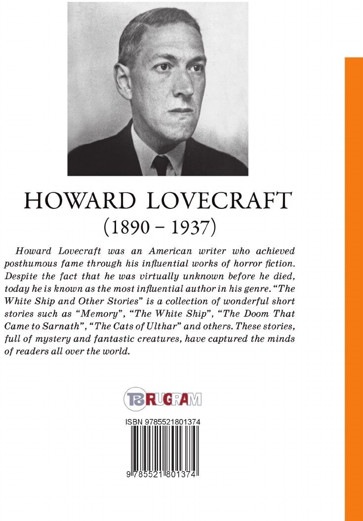 Howard Lovecraft was an American writer who achieved posthumous fame through his influential works of horror fiction. Despite the fact that he was virtually unknown before he died, today he is known as the most influential author in his genre. "The White Ship and Other Stories" is a collection of wonderful short stories such as "Memory," "The White Ship," "The Doom That Came to Sarnath," "The Cats of Ulthar" and others. These stories, full of mystery and fantastic creatures, have captured the minds of readers all over the world.