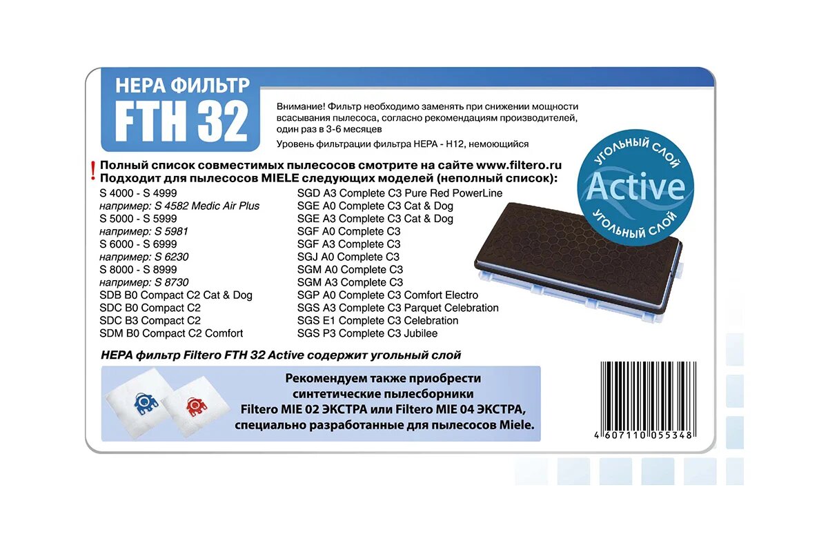 Техника для дома Filtero FTH 32 Фильтр Filtero FTH 32 уровня фильтрации нера Н 12. Содержит слой активированного угля Active, нейтрализует неприятные запахи накопившейся в мешке пыли - идеально для владельцев домашних животных. Препятствует выходу мельчайших частиц пыли и аллергенов из пылесоса в помещение. Фильтр немоющийся. Подлежит замене, согласно рекомендации производителя пылесосов - не реже одного раза за 6 месяцев.