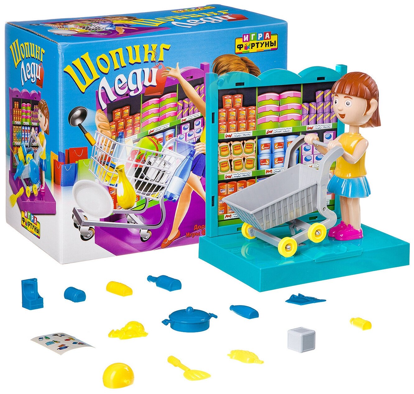 В комплекте: шопинг-леди, тележка, полка, платформа, игральный кубик,стикер.