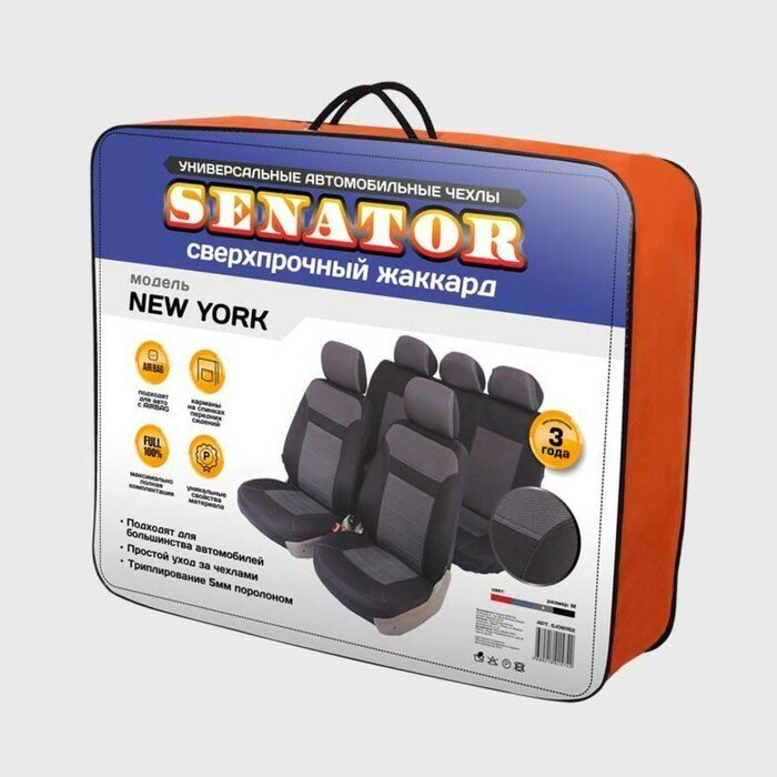 Универсальные ортопедические чехлы из сверхпрочного жаккарда. Применимы для 95% легкового автопарка РФ. Благодаря особому крою типа «В» чехлы идеально облегают сидения автомобиля. Специальный боковой шов позволяет применять авто чехлы в автомобилях с боковыми подушками безопасности (AIR BAG). Раздельная схема надевания обеспечивает легкую установку авто чехлов. Дополнительное удобство создает наличие предустановленных крючков, утягивающего шнура, фиксирующей липучки на передних спинках, а также предустановленной прорези для установки подголовника. Материал триплирован огнеупорным поролоном 5 мм, за счет чего чехол приобретает дополнительную мягкость и устойчивость к возгоранию. Авточехлы Senator Жаккард New York износоустойчивы и легко стирается в стиральной машине.
