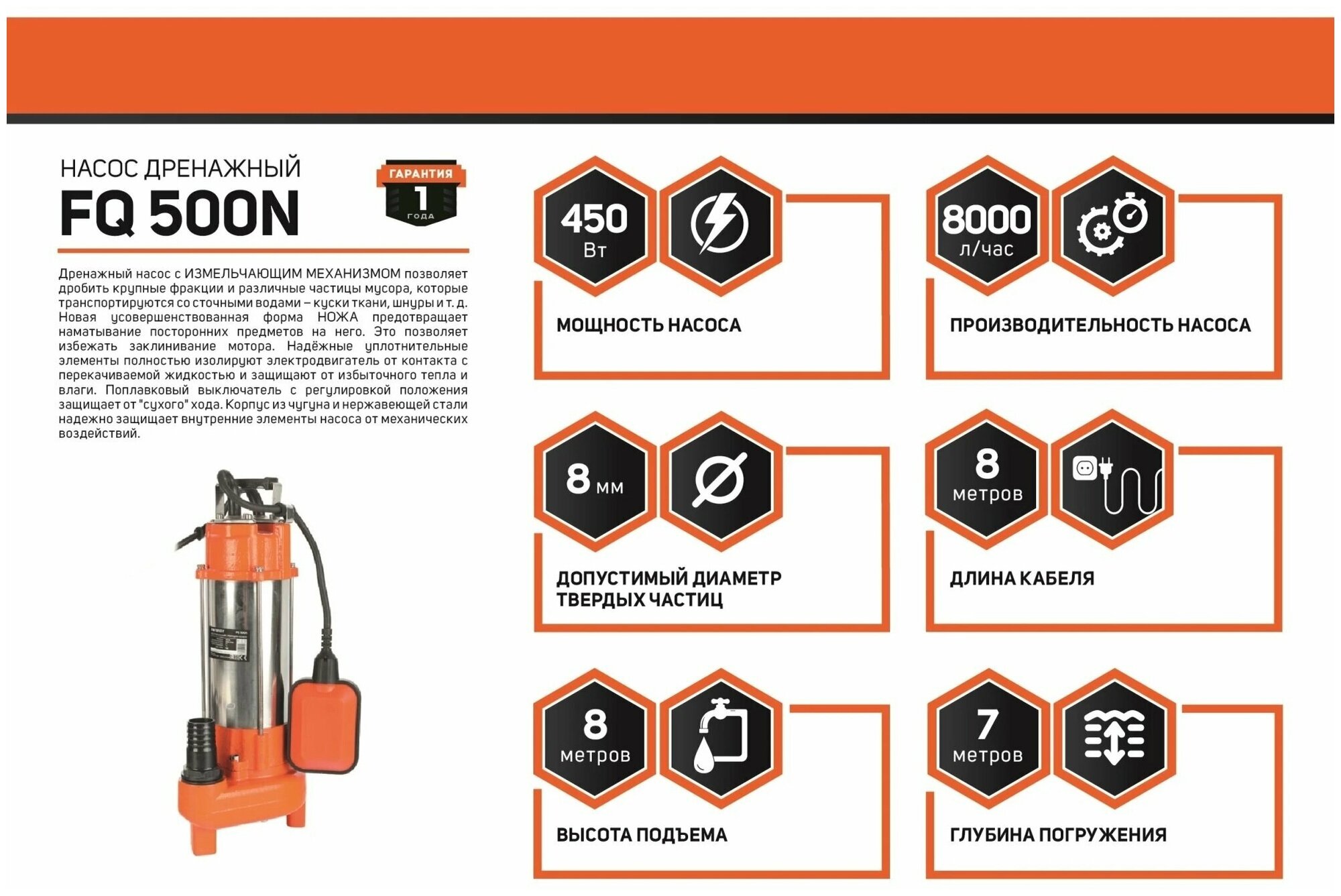 PATRIOT FQ500 N - погружной канализационный насос для откачивания бытовых сточных вод. Модель оснащена режущим механизмом, легко измельчающим различные отбросы.
