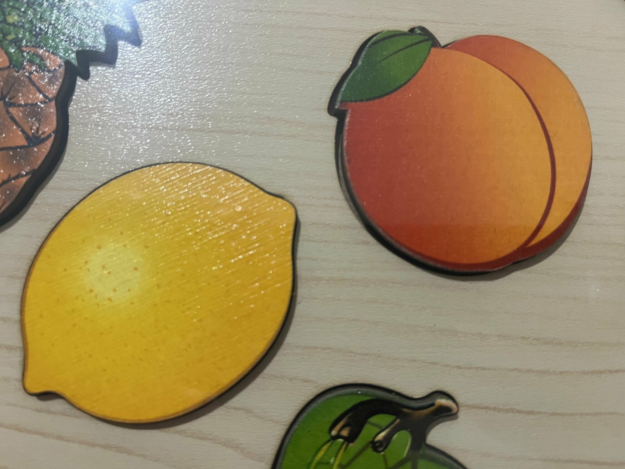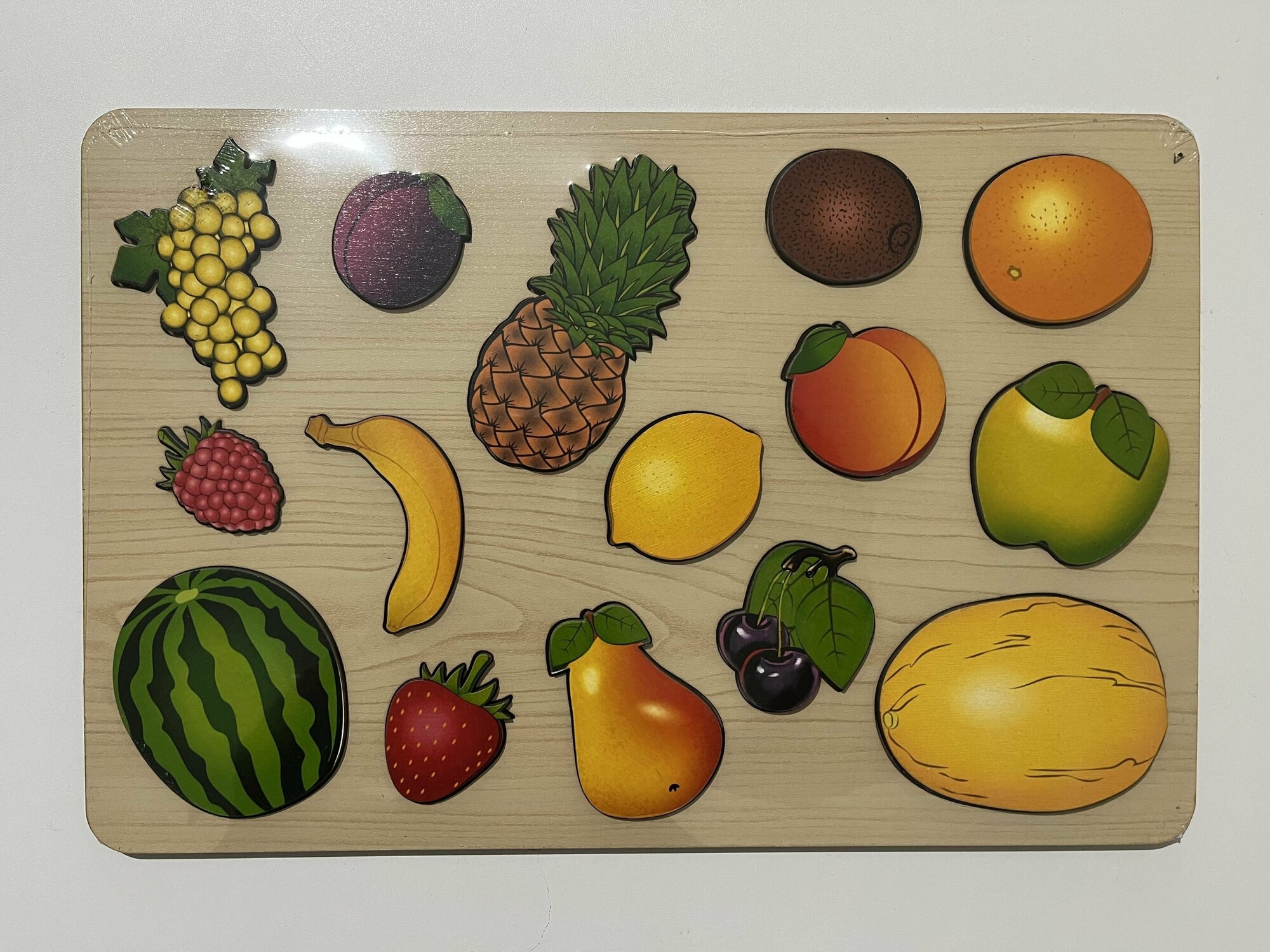Эта развивающая игра, которая обязательно понравится вашему ребенку. На игровом основании расположены пятнадцать углублений, в которые можно вставлять вкладыши, изображающие фрукты (груша, лимон, яблоко, виноград и т. д.). Необходимо подобрать каждому вкладышу подходящее место.