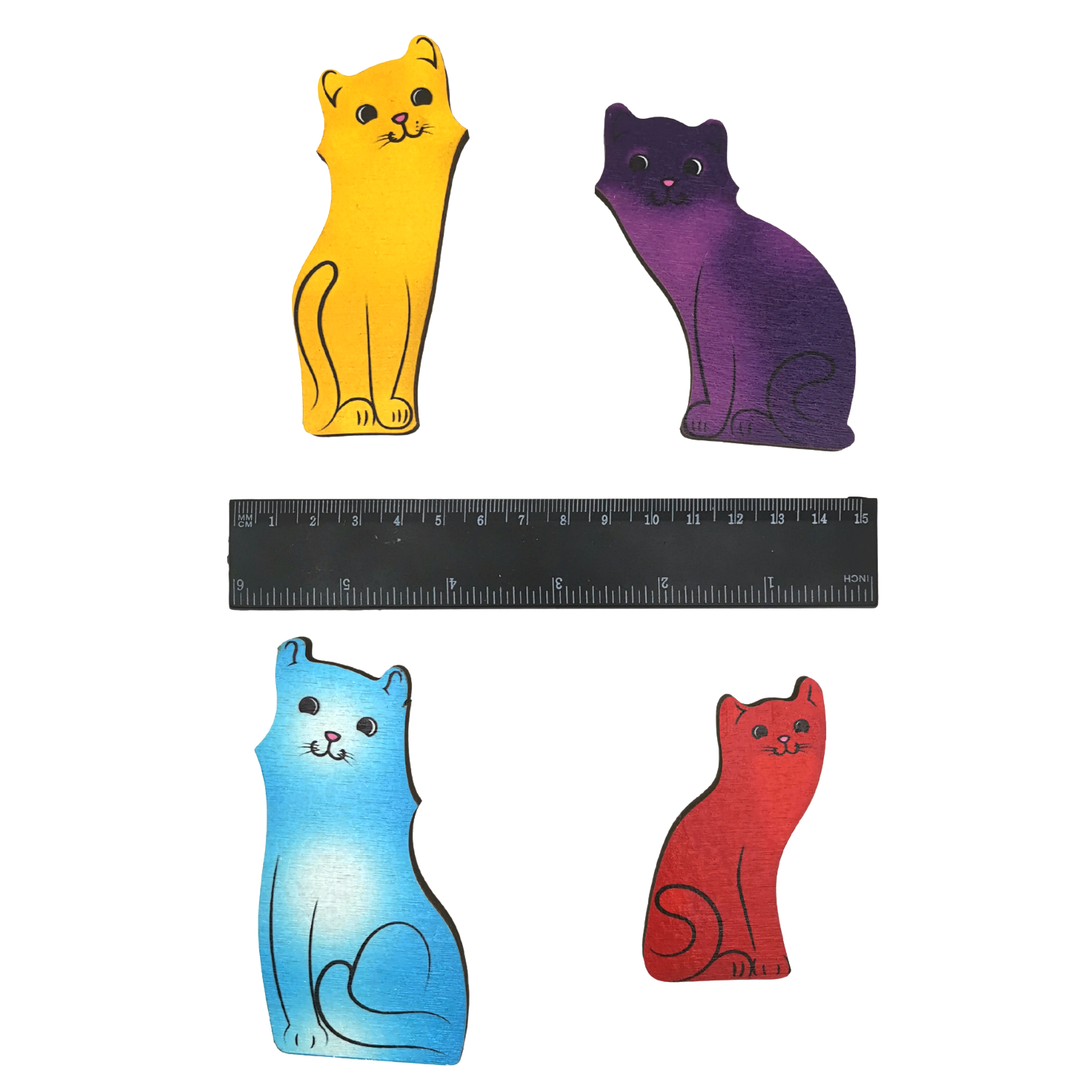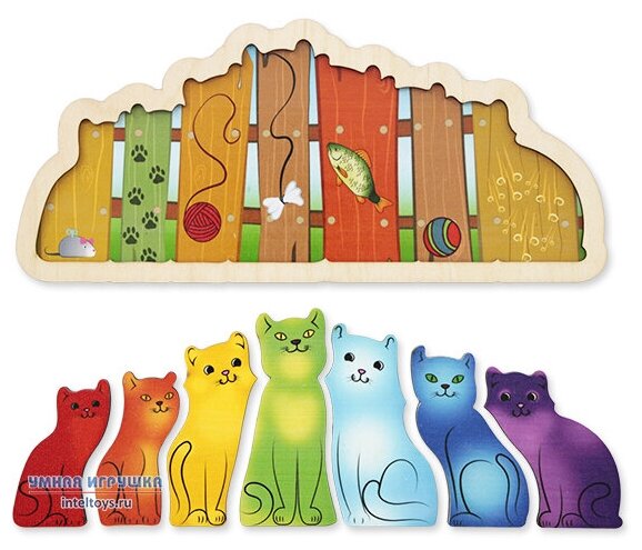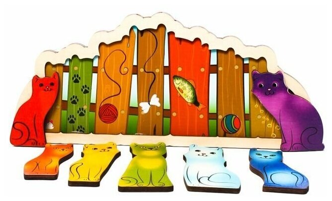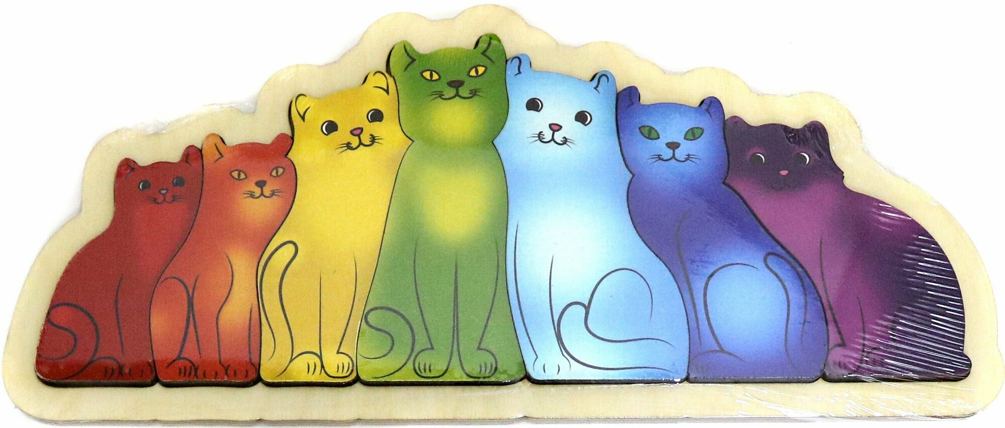 Очаровательная головоломка-пазл "Разноцветные котята" для развития пространственного мышления, изучения основных цветов, понятия "большой-маленький". Задача ребенка — правильно разместить красочные фигурки на деревянном основании, чтобы получилась цельная картинка. 7 вкладышей-котят окрашены в цвета радуги.