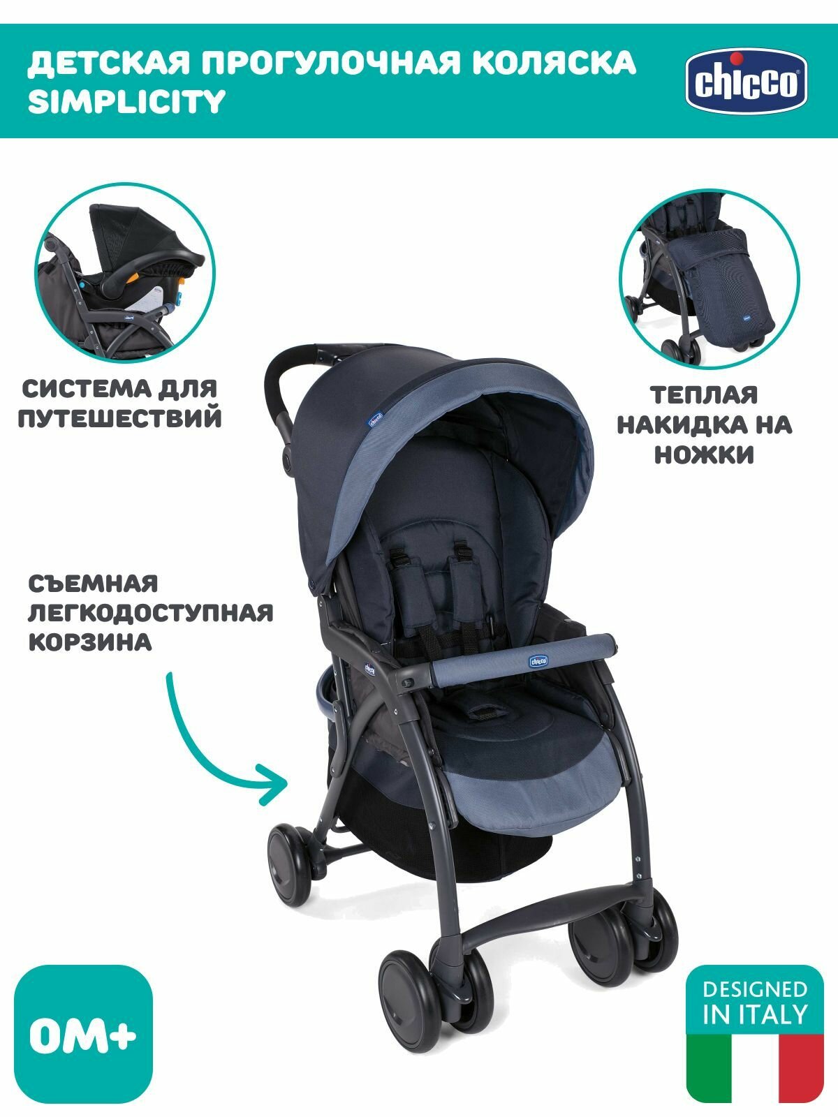 SimpliCity Top — стильная и практичная коляска для городских жителей. Прогулочная коляска SimpliCity Top от Chicco легкая, удобная и практичная. Благодаря широкому и комфортному сидению обеспечивает комфорт для малыша во время прогулок. Коляску легко складывать и раскладывать одной рукой. Благодаря большой и легкодоступной корзине, коляска SimpliCity прекрасно подходит для ежедневных прогулок.