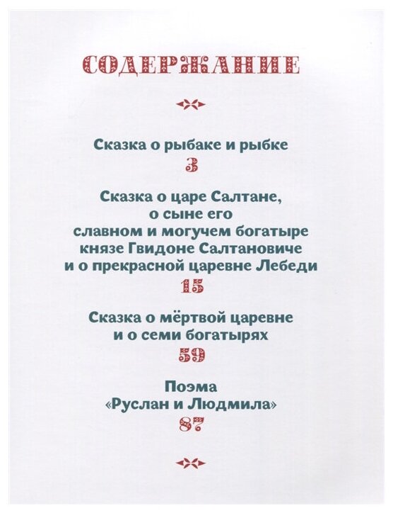 Сборник отлично подходит для знакомства детей с творчеством Александра Сергеевича Пушкина. Под обложкой вас ждут любимые герои: золотая рыбка, кот учёный, царевна лебедь, Руслан и Людмила. Сказки Л. С. Пушкина расскажут о дружбе, отваге, любви, волшебных превращениях и увлекательных приключениях. Сказочный мир,