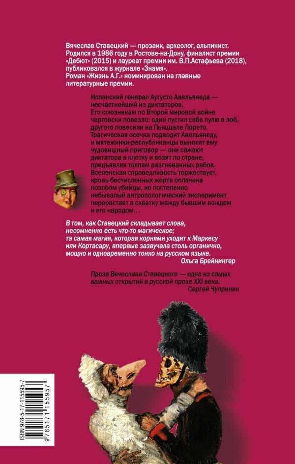 Вячеслав Ставецкий - прозаик, археолог, альпинист. Родился в 1986 году в Ростове-на-Дону, финалист премии "Дебют" (2015) и премии им. В.П.Астафьева (2018), публиковался в журнале "Знамя". Роман "Жизнь А.Г." номинирован на главные литературные премии. Испанский генерал Аугусто Авельянеда - несчастнейший из диктаторов. Его союзникам по Второй мировой войне чертовски повезло: один пустил себе пулю в лоб, другого повесили на Пьяццале Лорето. Трагическая осечка подводит Авельянеду, и мятежники-республиканцы выносят ему чудовищный приговор - они сажают диктатора в клетку и возят по стране, предъявляя толпам разгневанных рабов. Вселенская справедливость торжествует, кровь бесчисленных жертв оплачена позором убийцы, но постепенно небывалый антропологический эксперимент перерастает в схватку между бывшим вождем и его народом…
